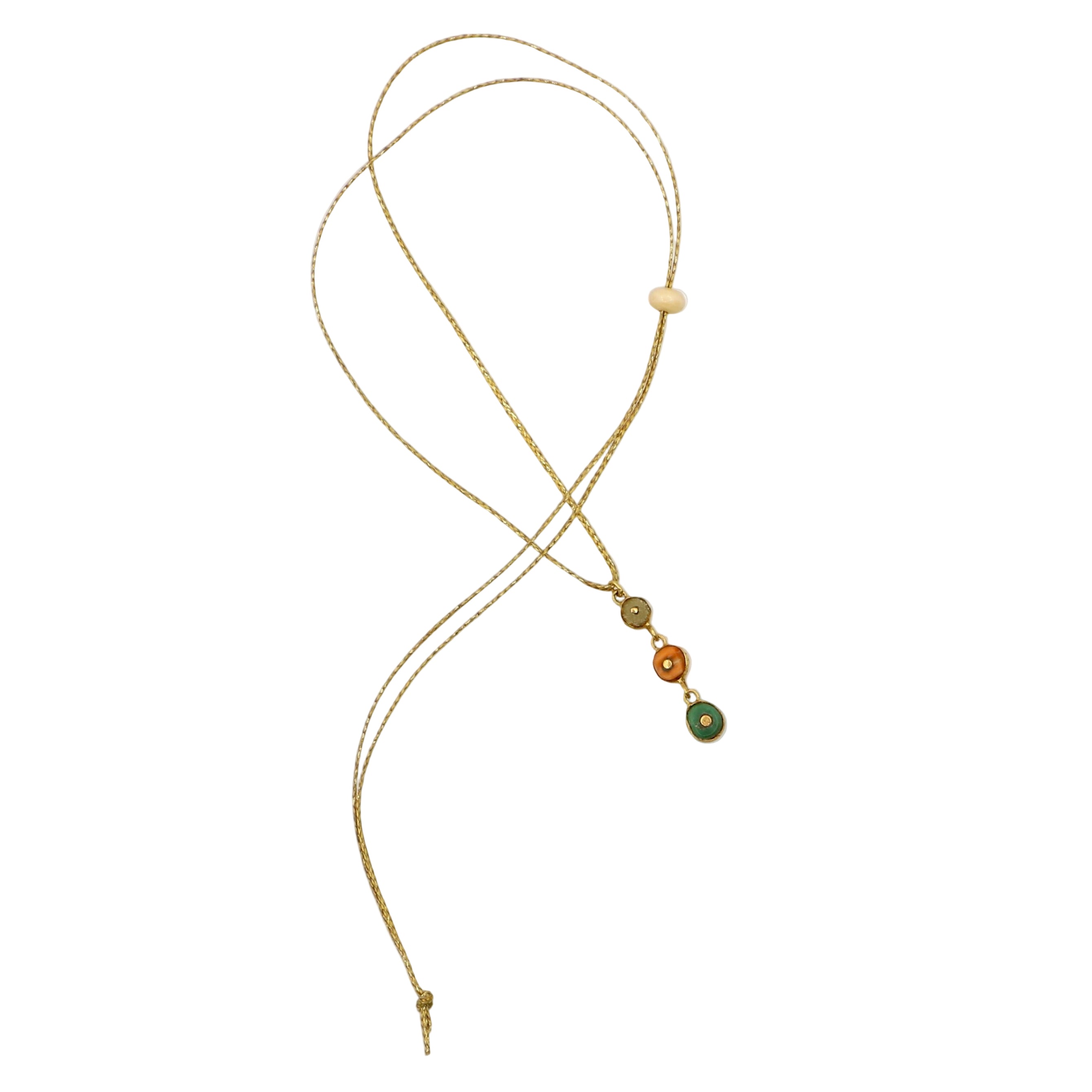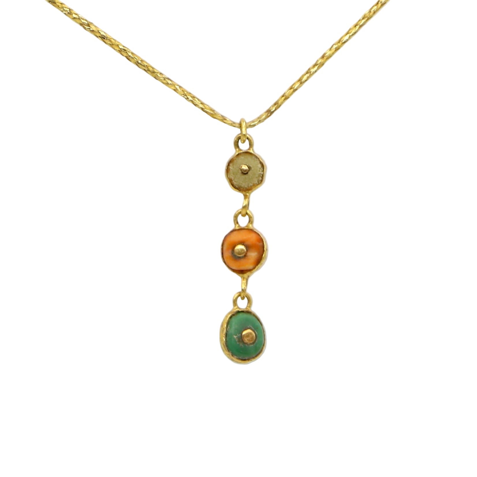 A lovely and whimsical triple drop pendant that incorporates three different colored beads. A glass bead, coral and turquoise chimu beads are also part of this solid 22k gold pendant. Strung on a thin 22'' long metallic cord with a bone bead added for adjustability in length.
