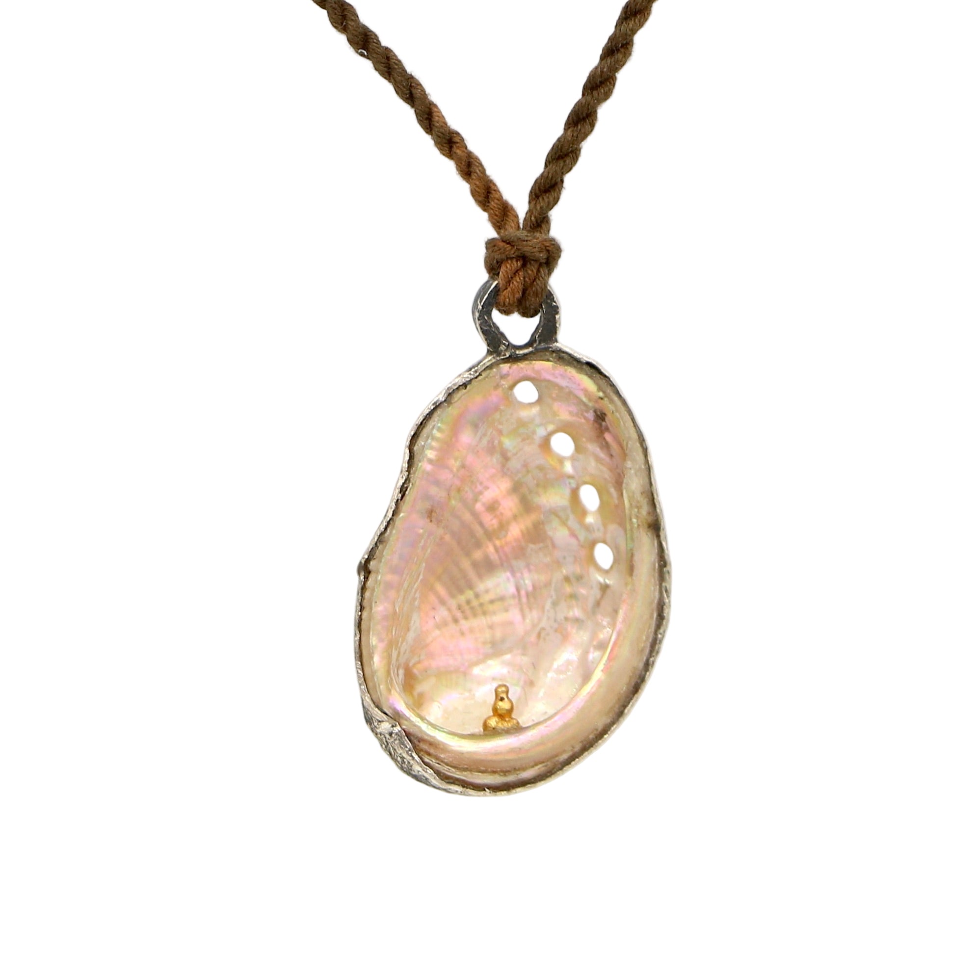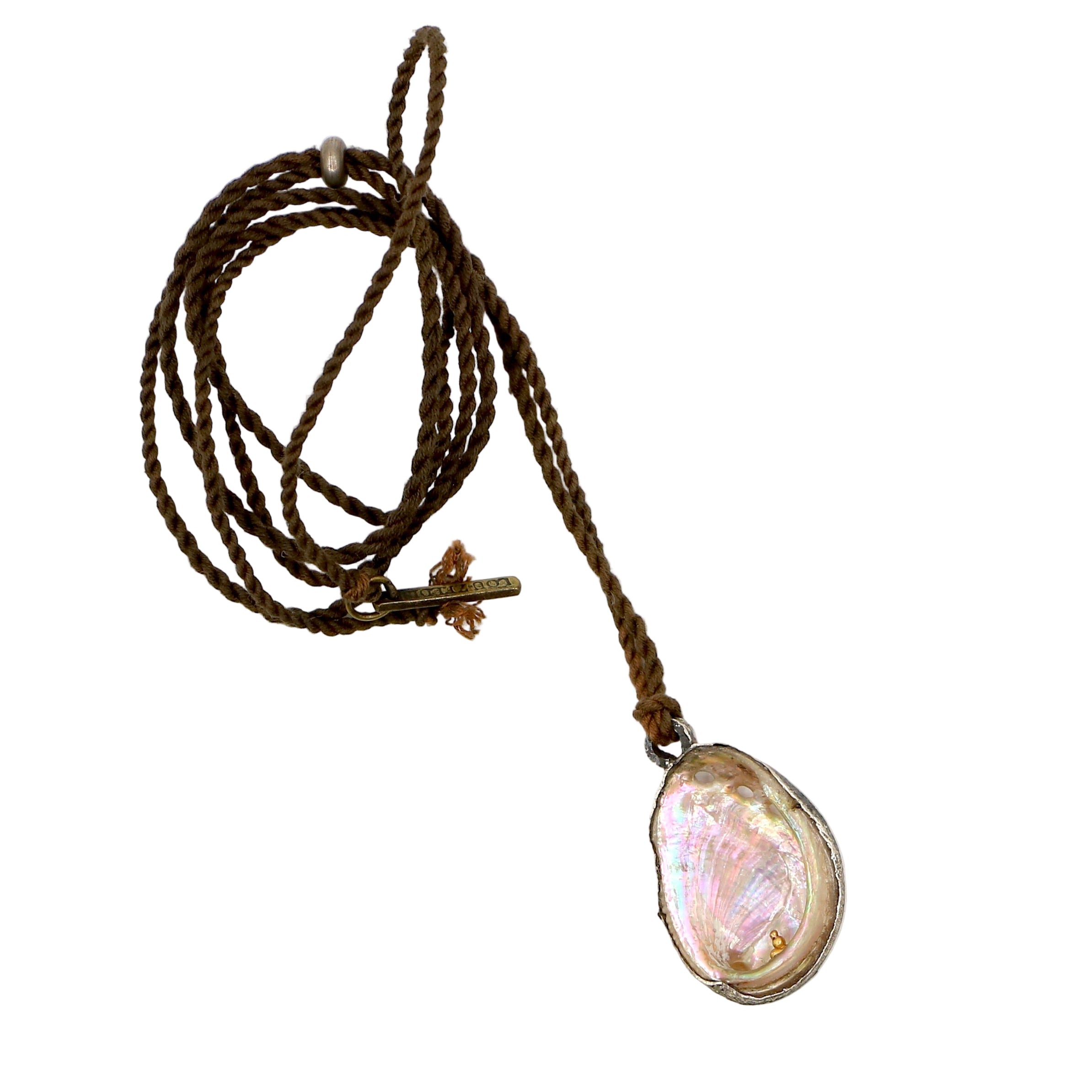 LoU's wonderful abalone shell with a 22k solid buddha set inside the base of the shell. These pieces are sought after and are a combination of sterling silver, shell and solid 22k gold. Strung on a hand dyed dark brown hand twisted cord measuring 36'' in length. A brass bead is used for adjustability in length and LoU's insignia tag hangs from the end.
