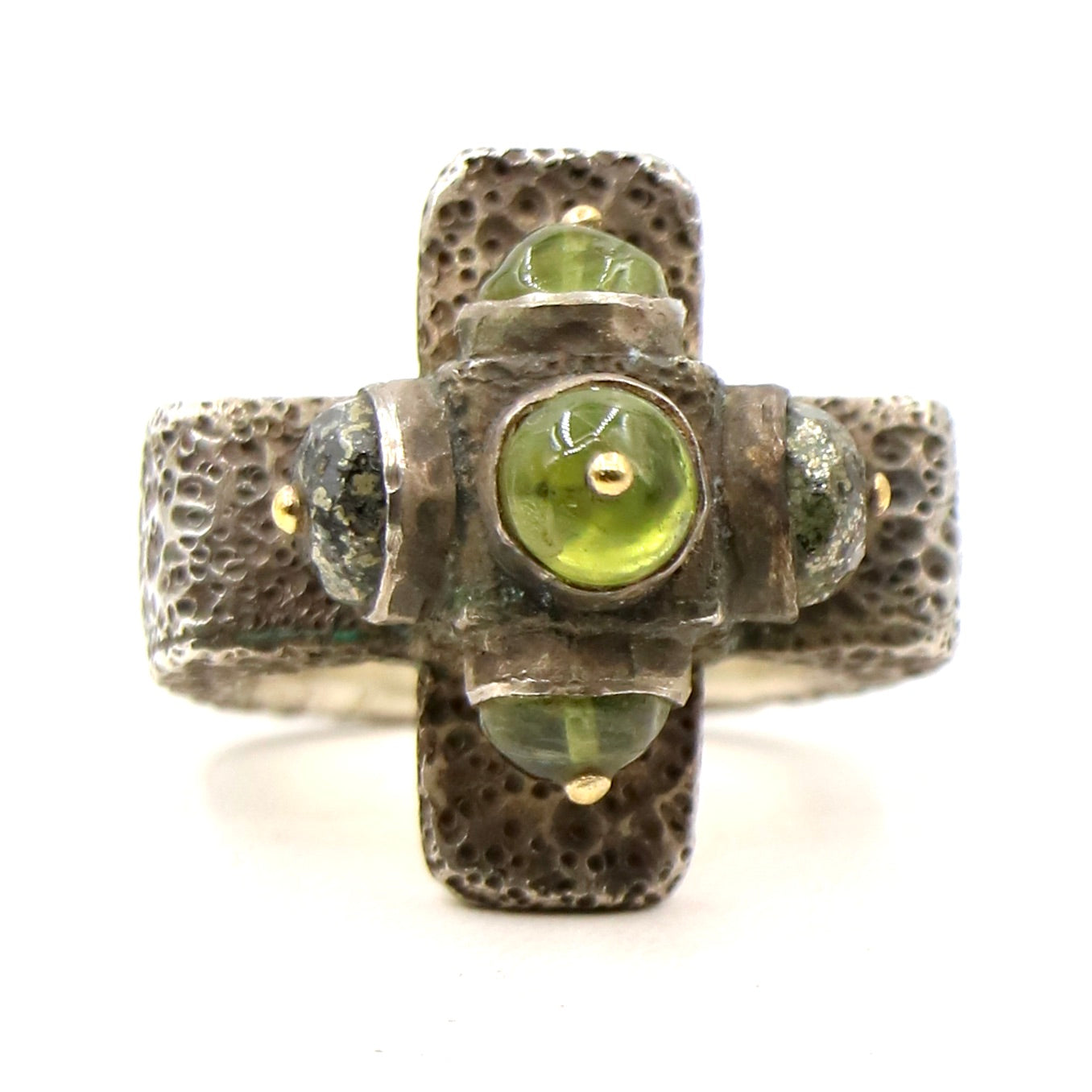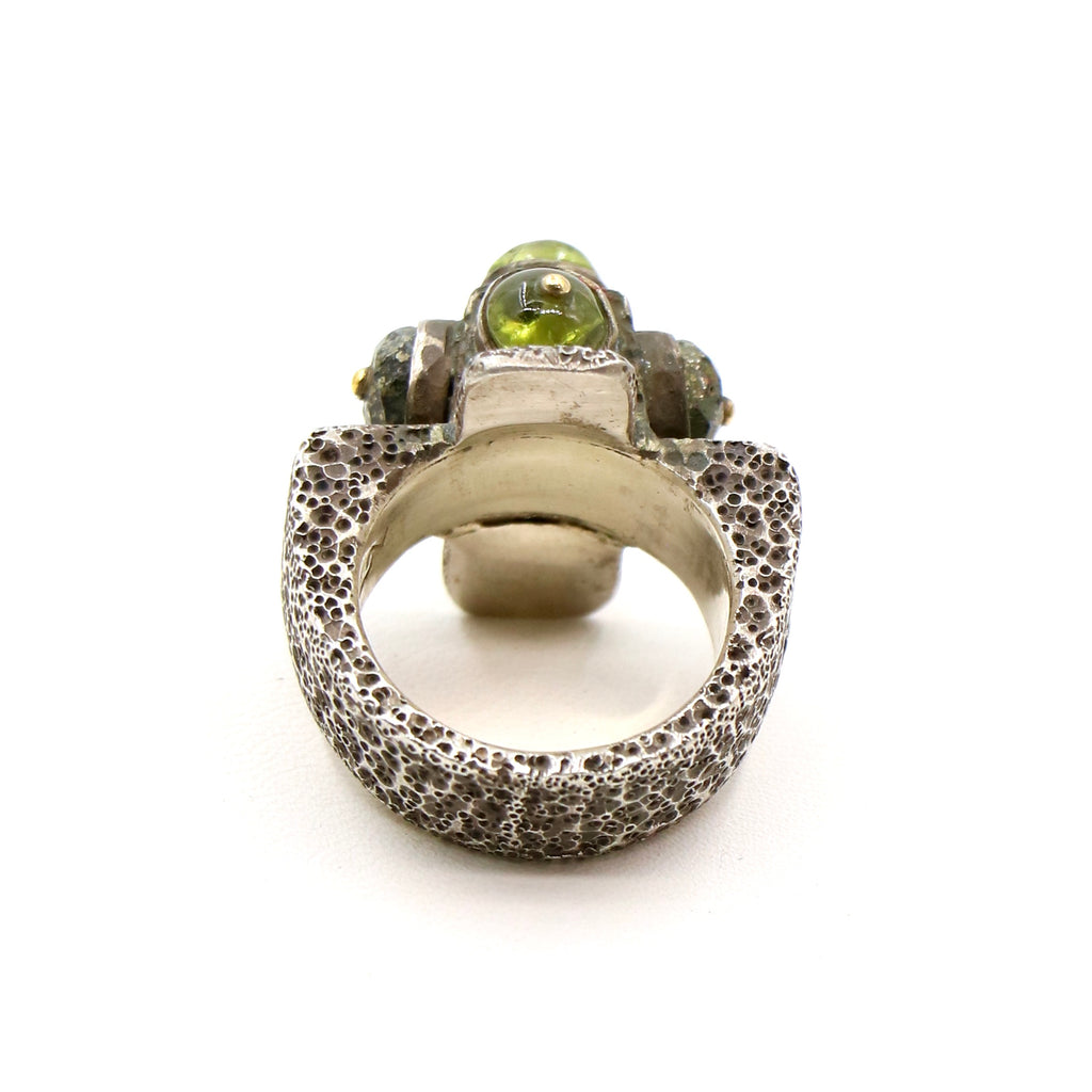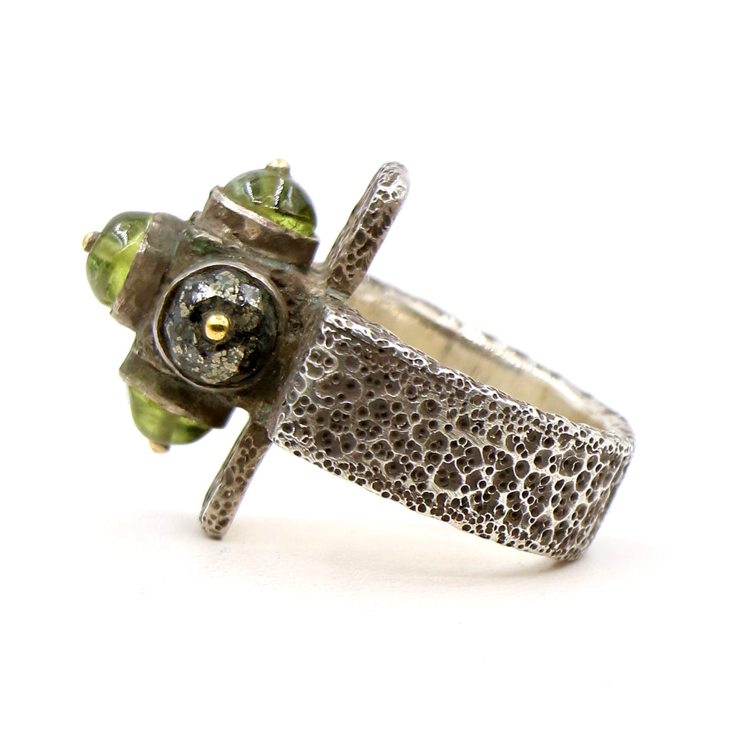 A fabulous and rare LoU Zeldis creation. His five point ring with a brilliant green gemstone. Set with beautiful pin work into a textured band. A true LoU treasure
