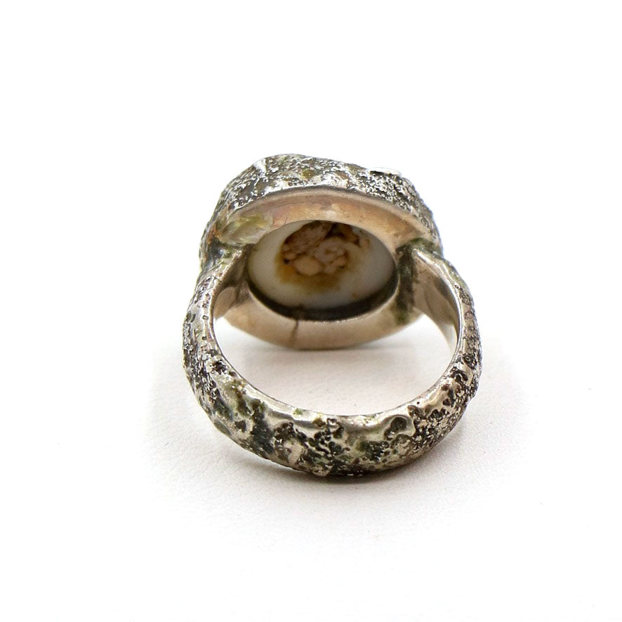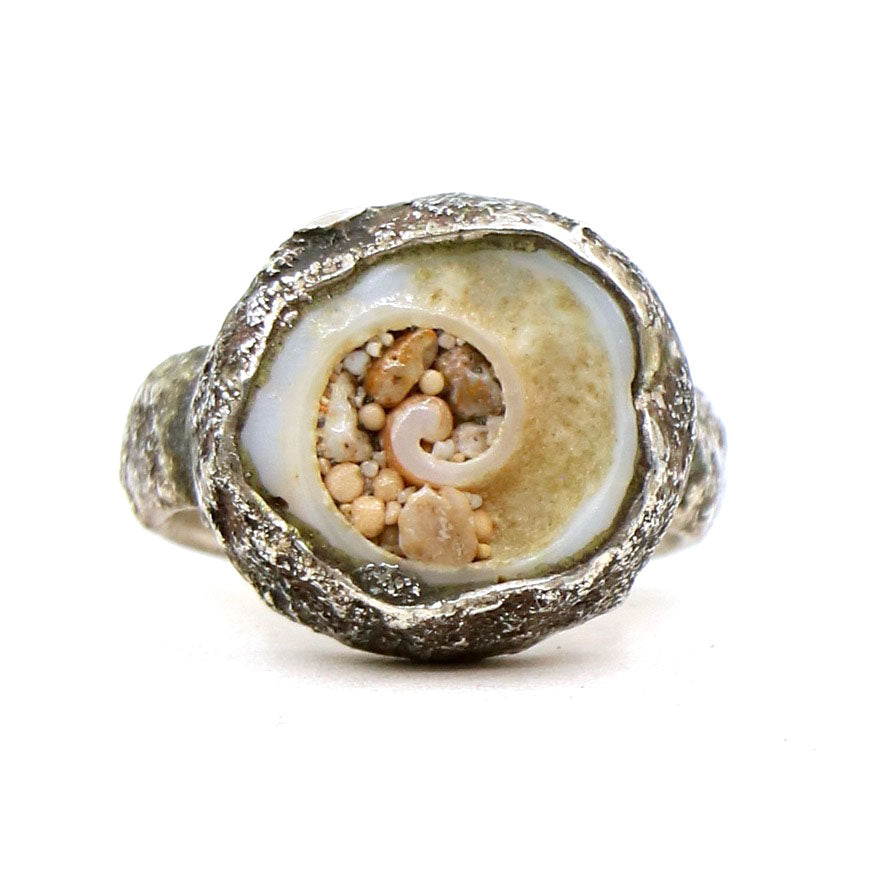 LoU created these wonderful shell rings. The shells he would gather on the eastern shores of Bali. Set in a textured sterling silver band they are a classic and oh so beautiful LoU collectable.