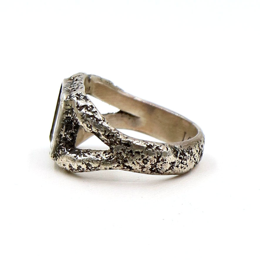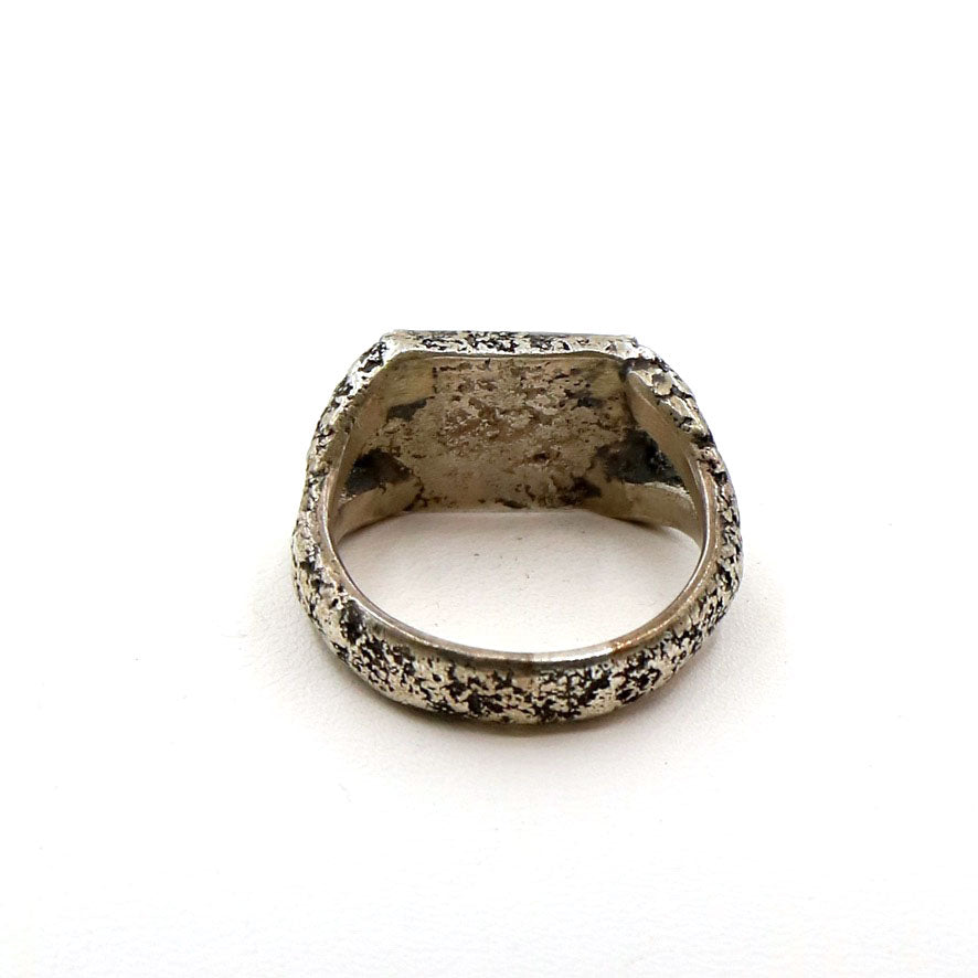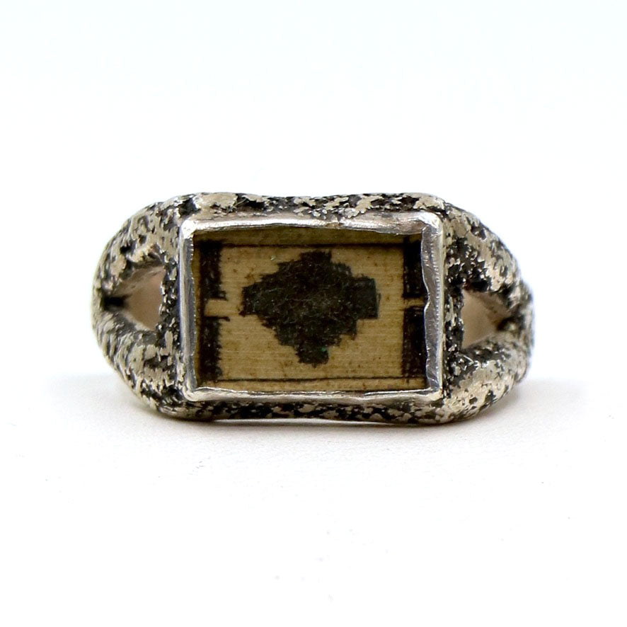 A wonderful LoU creation. This ring is inscribed in a palm leaf and then set behind a glass cover and then incorporated into a fabulous LoU silver setting. There are very few of these remaining in the collection.