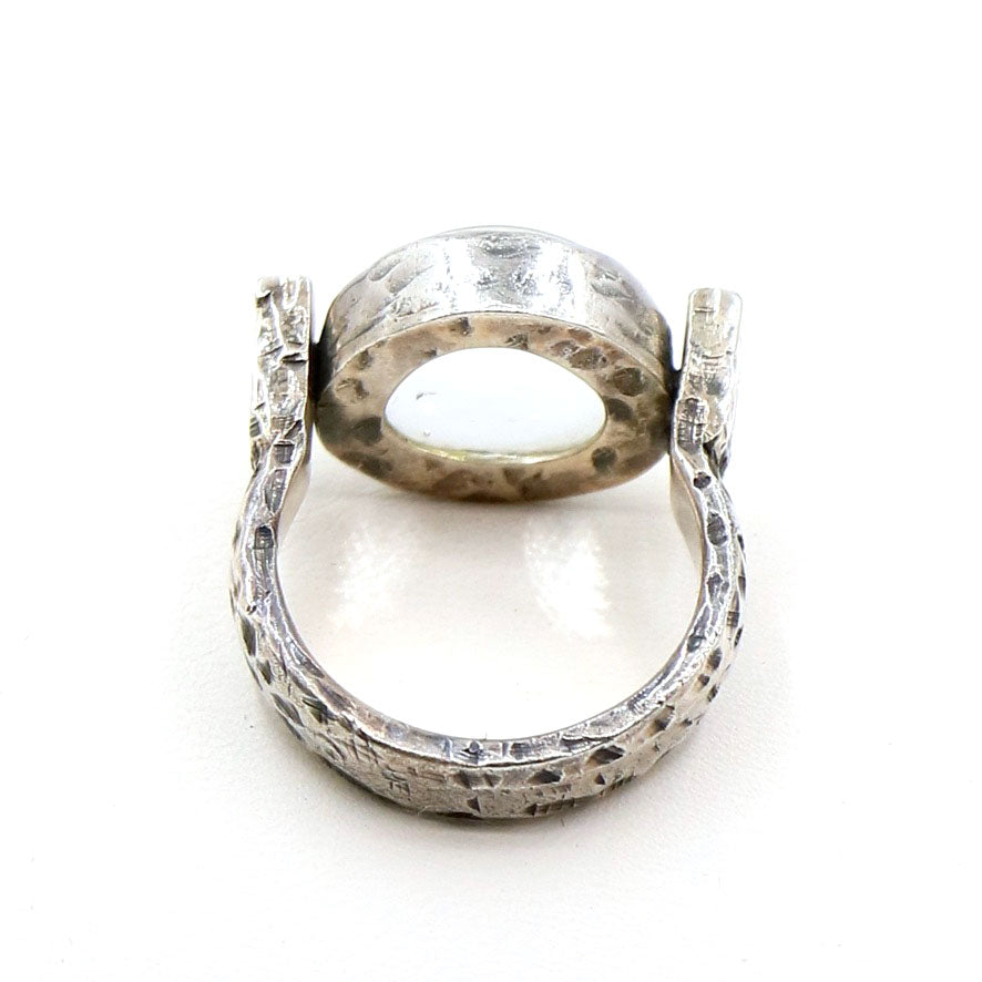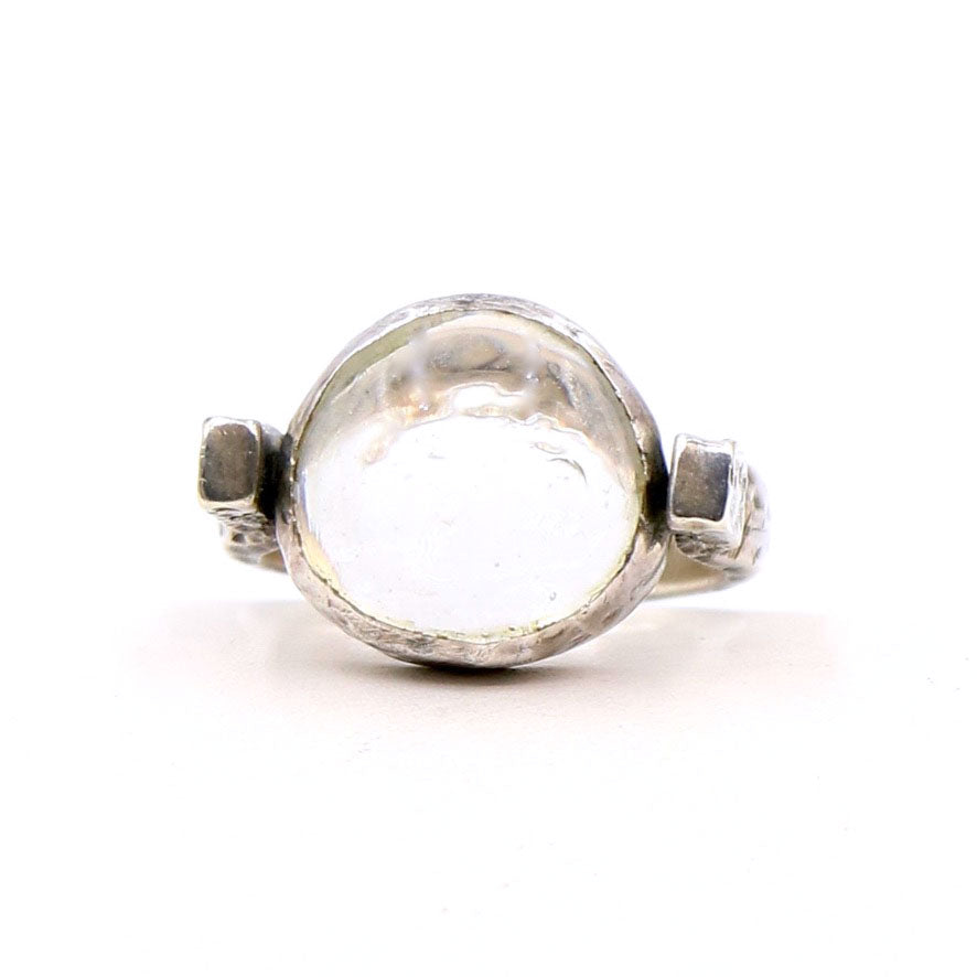 LoU created a series of these wonderful clear glass disks set in a contemporary silver band. This particular one has a wonderful whittled texture to the band. His insignia is stamped inside the band.