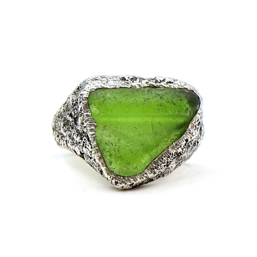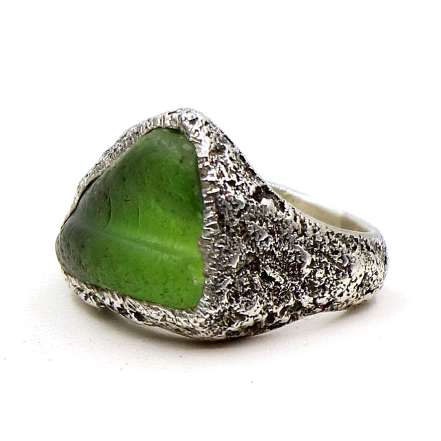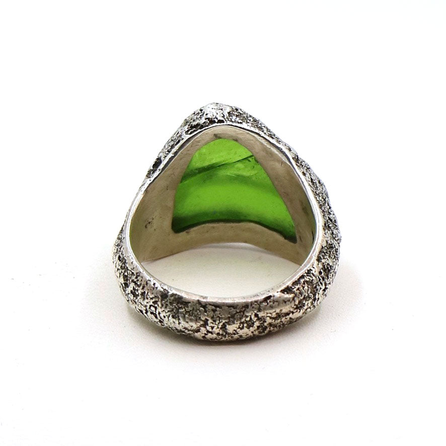 One of the last of the sought after LoU bottle neck rings from green bottle glass and set in his classic textured band. His insignia is stamped inside. These rings are also coveted for their incredible comfort on the hand.