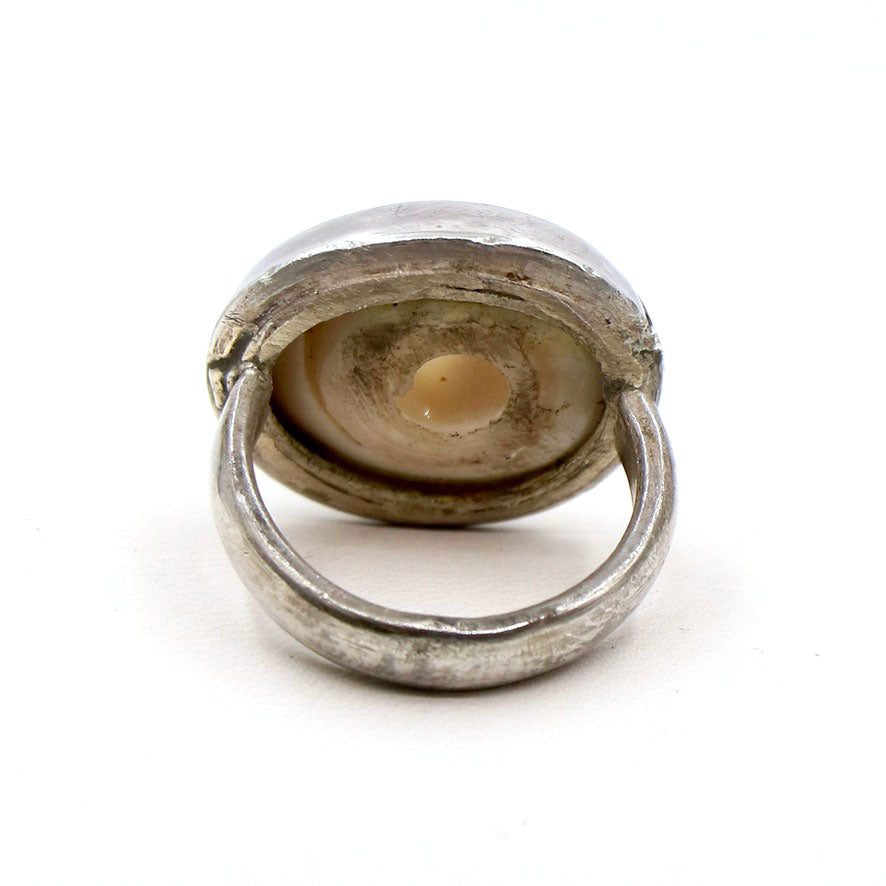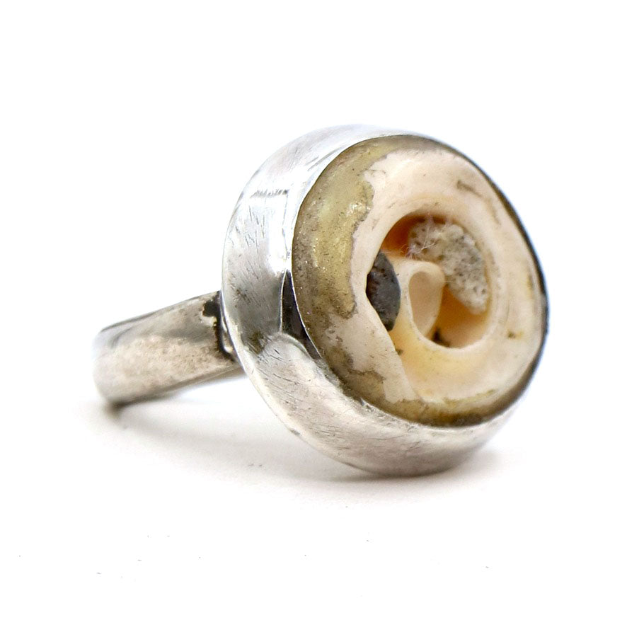 A wonderful shell ring set in a smooth sterling silver band. This particular shell has a great peep hole to see through to the finger which creates a joyful twist on LoU's traditional shell rings. The shell has also maintained its little black pebble set inside the crevice of the shell's curves.