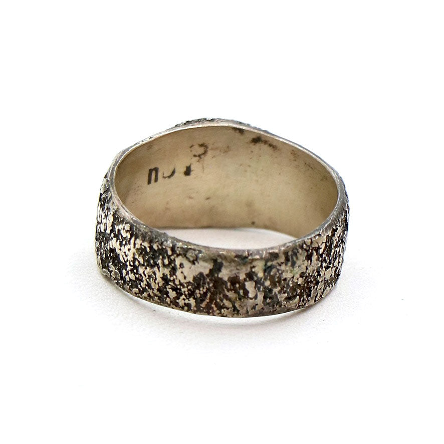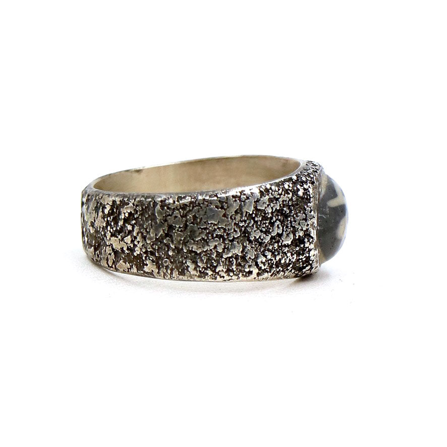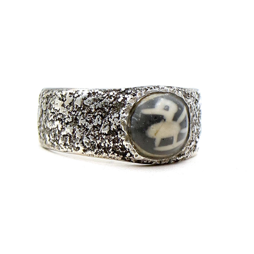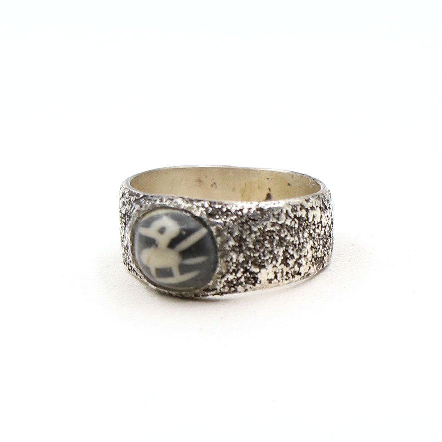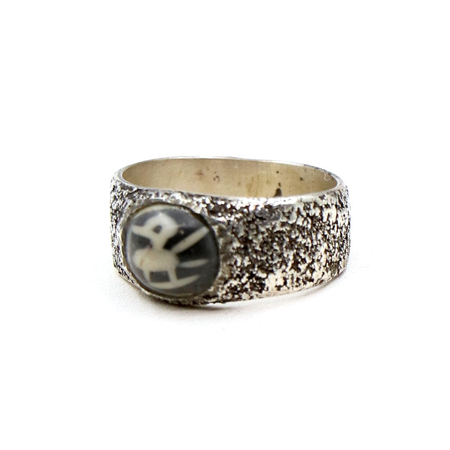 A sweet hand made glass murrini bird ring in blue glass from Java set in a classic textured LoU band. LoU's original 'LOU' stamped insignia in inside the band. A wonderful ring on any hand.