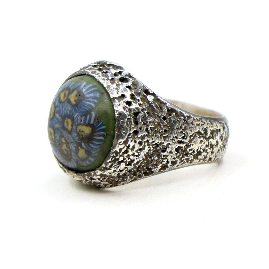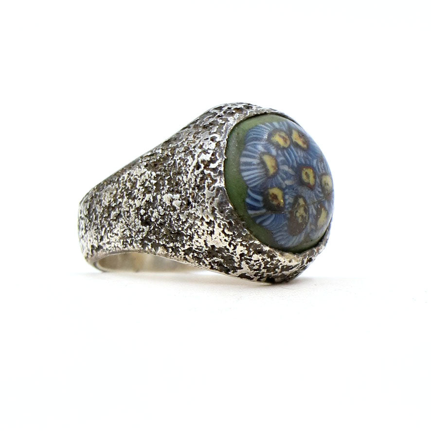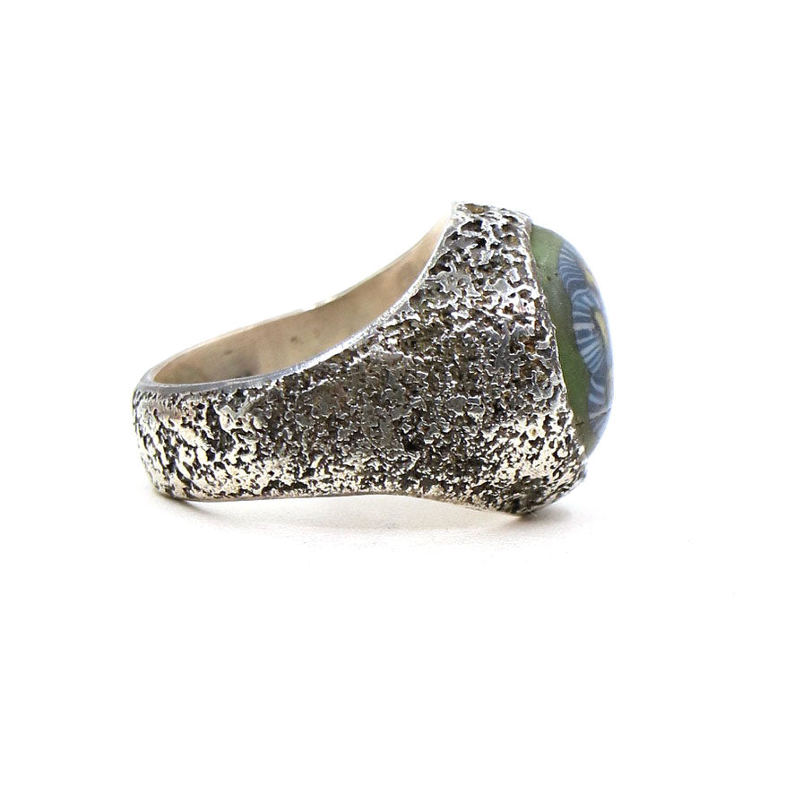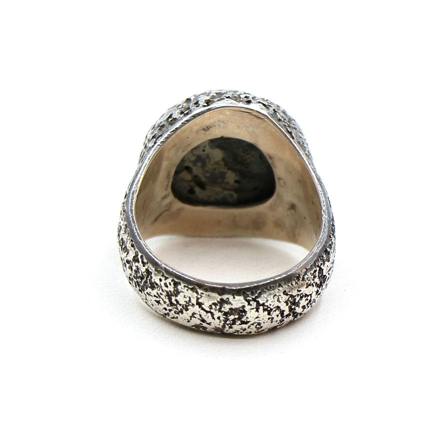 A wonderful old trade bead is set in this textured ring with an old 'LoU' stamp inside. This ring is a wonderful treasure from the collection and its shape makes it a fabulous pinky ring or can be easily worn on any finger. A rare beauty.