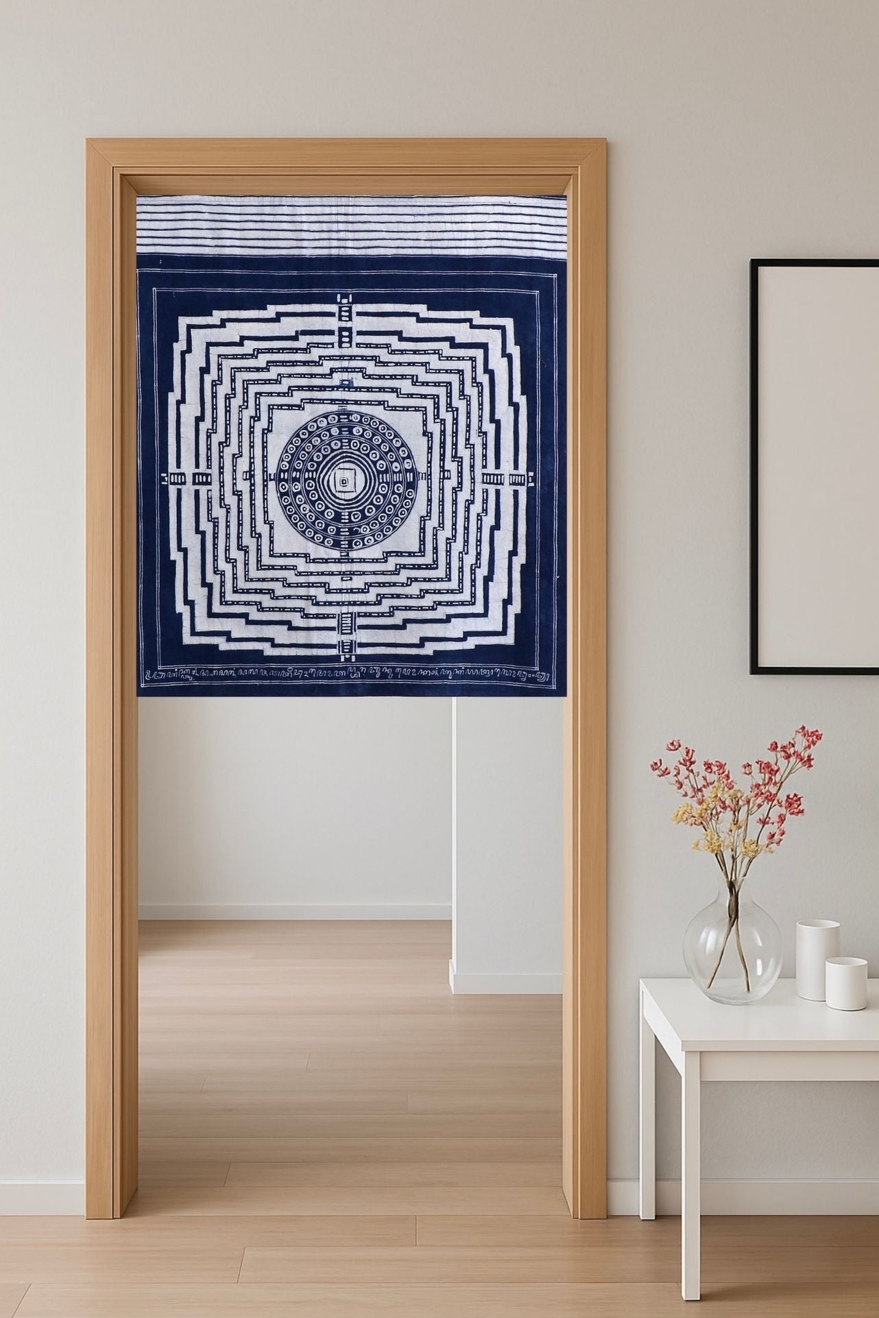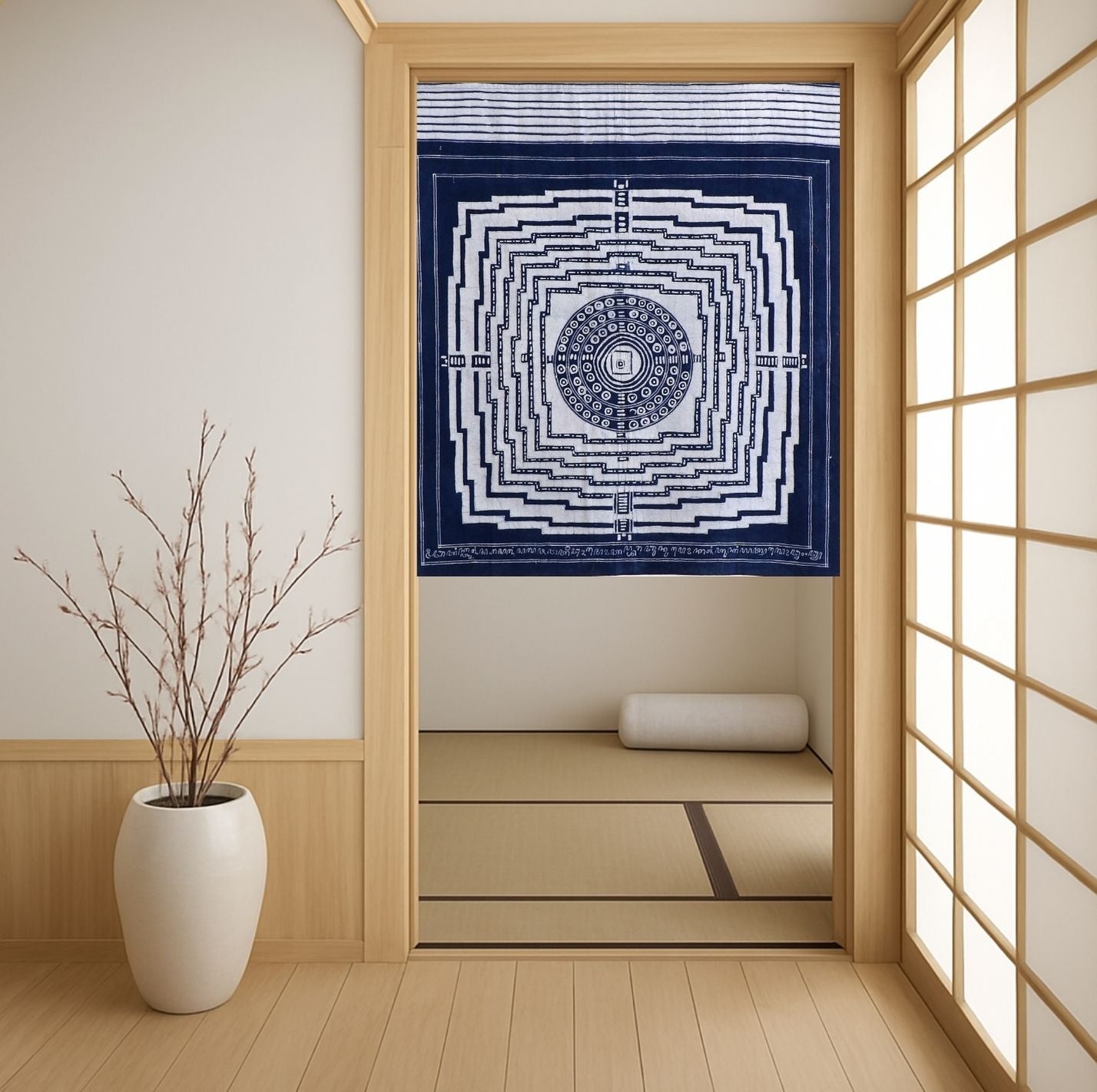 The noren is a traditional Japanese textile that can be used as a room divider or decorative element. They are placed in doorways both inside and outside. They assist in climate control, privacy and their movement can also keep the bugs out. LoU having grown up in Japan has taken this tradition and worked them into his batik designs utilizing all natural indigo and soga dyes to create these exquisite contemporary design motifs. They can also be hung directly on the wall as works of art.