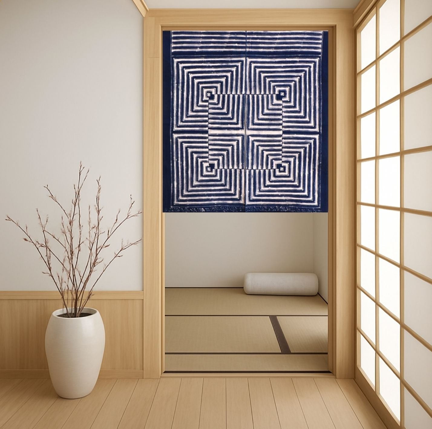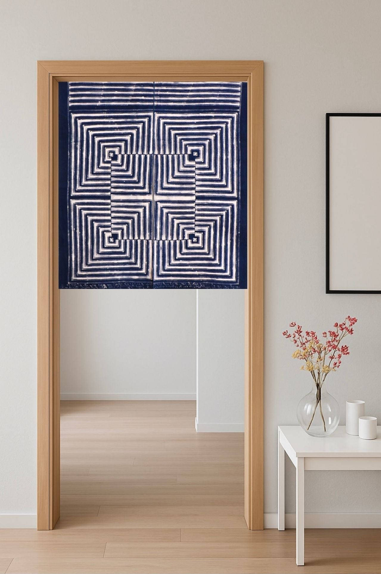 The noren is a traditional Japanese textile that can be used as a room divider or decorative element. They are placed in doorways both inside and outside. They assist in climate control, privacy and their movement can also keep the bugs out. LoU having grown up in Japan has taken this tradition and worked them into his batik designs utilizing all natural indigo and soga dyes to create these exquisite contemporary design motifs. They can also be hung directly on the wall as works of art.