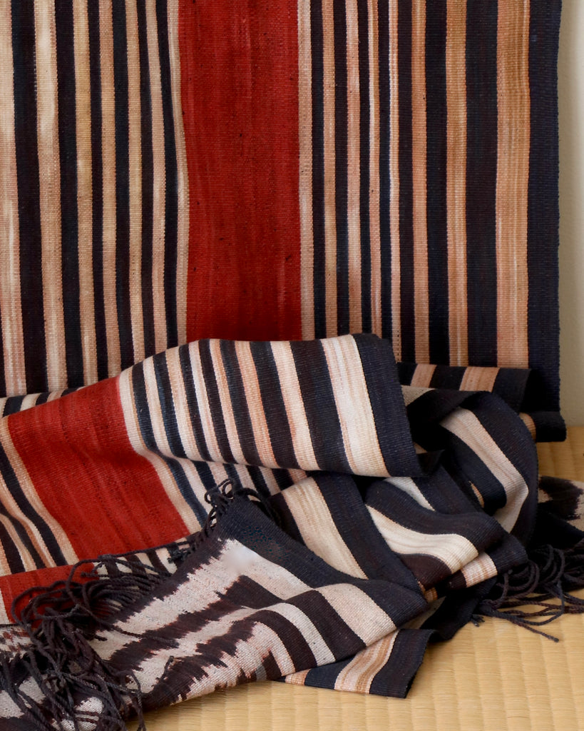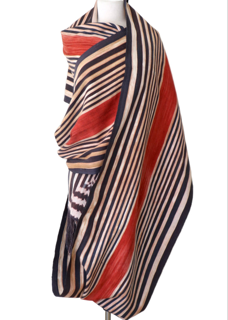 LoU created a beautiful series of ikats entitled 'Portals". They are entirely hand woven and hand dyed with all natural morinda citrifolia and indigo dyes. Woven in the traditional way by master craftsmen on the Indonesian island of Sumba. They are wonderful when used as interior design elements such as wall hangings or bed throws or table runners and can also be worn as a unique fashionable one of a kind wrap or shawl. LoU's modern motifs are innovative and breathtakingly beautiful.