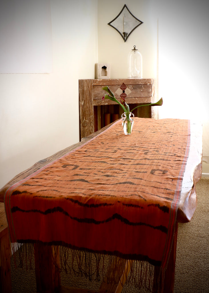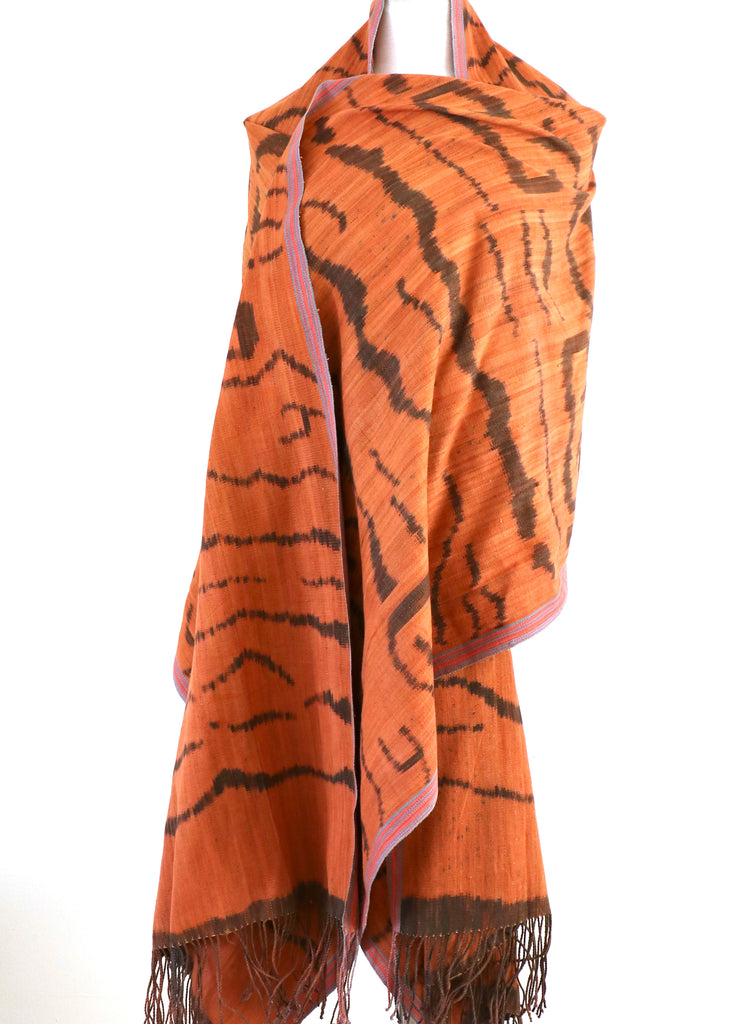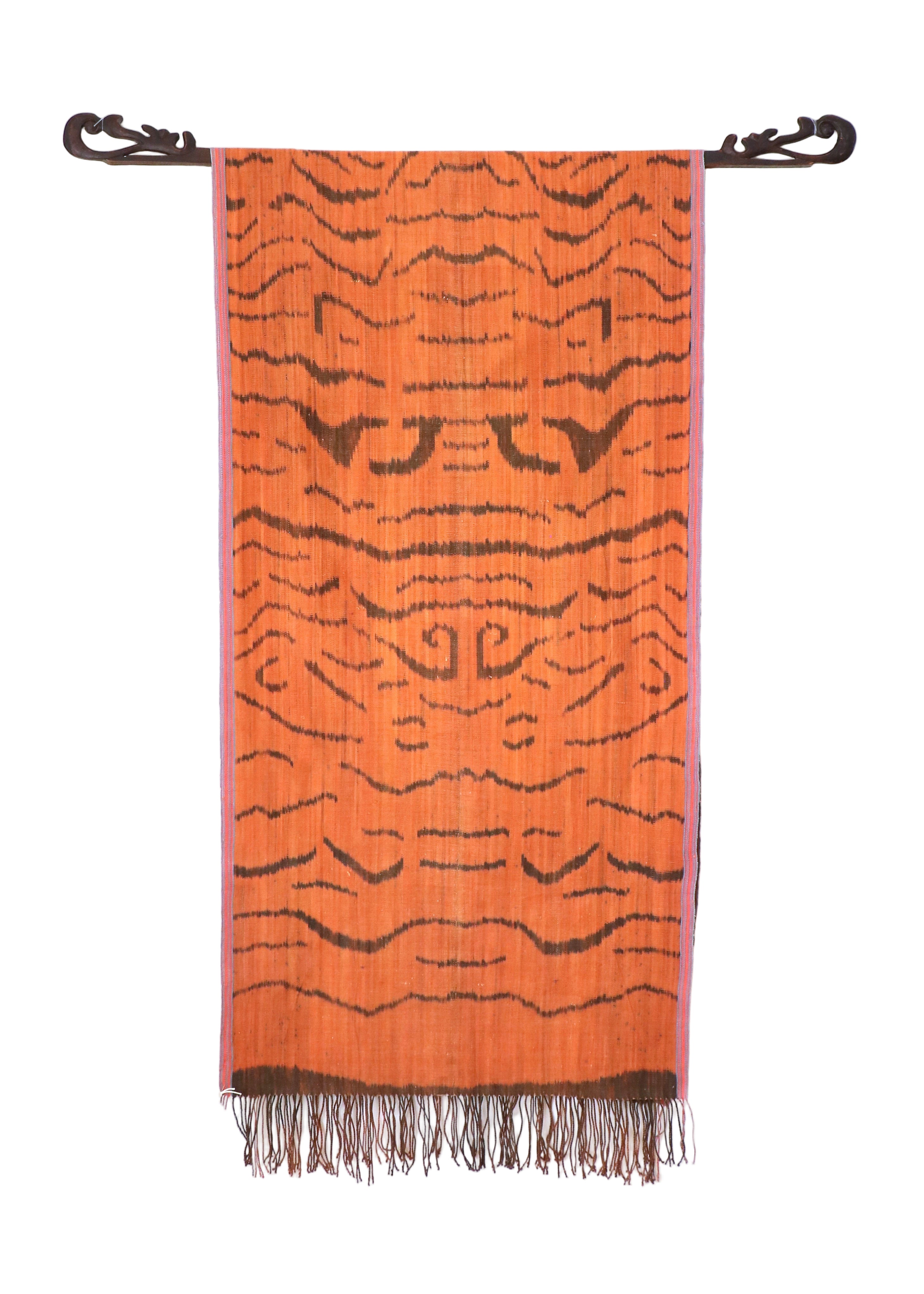 A fabulous 'tiger ikat' created on the island of Sumba in Indonesia. These textiles LoU created are heavily sought after. All natural dyes, hand woven natural fibers with a lusciously soft feel. Perfect as a wrap, a scarf or a dramatic wall hanging.