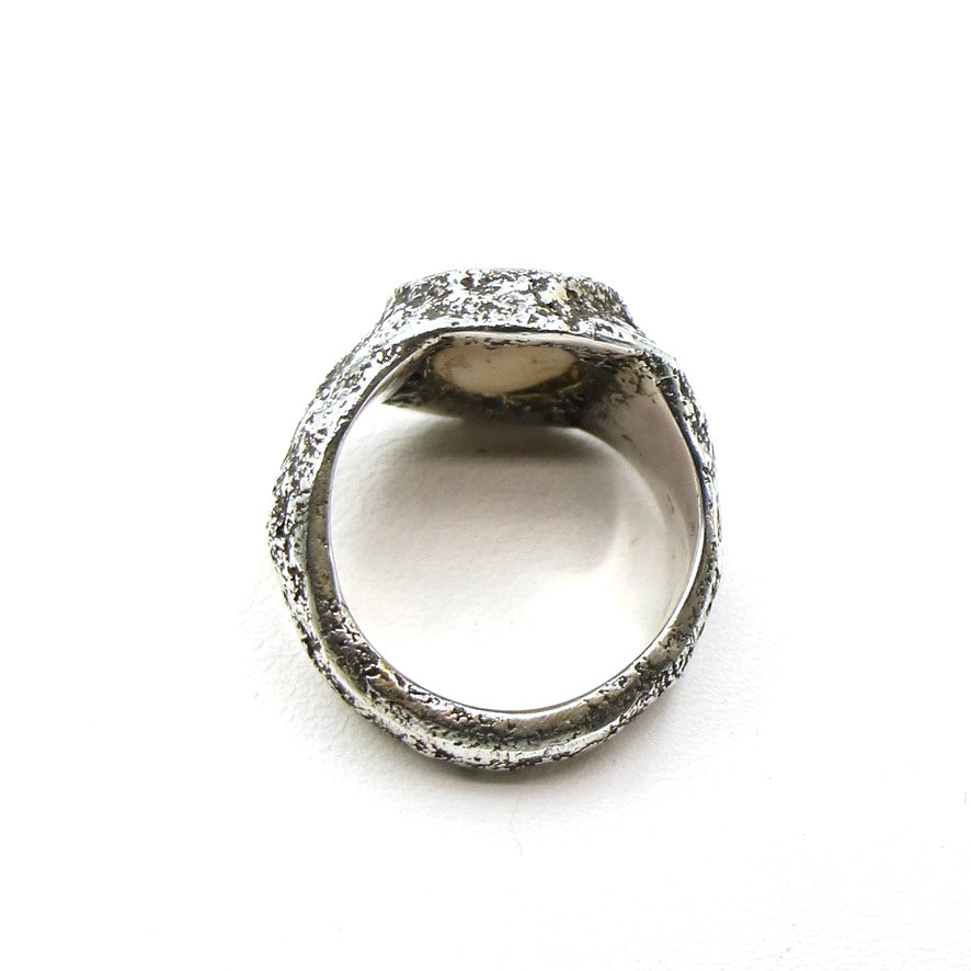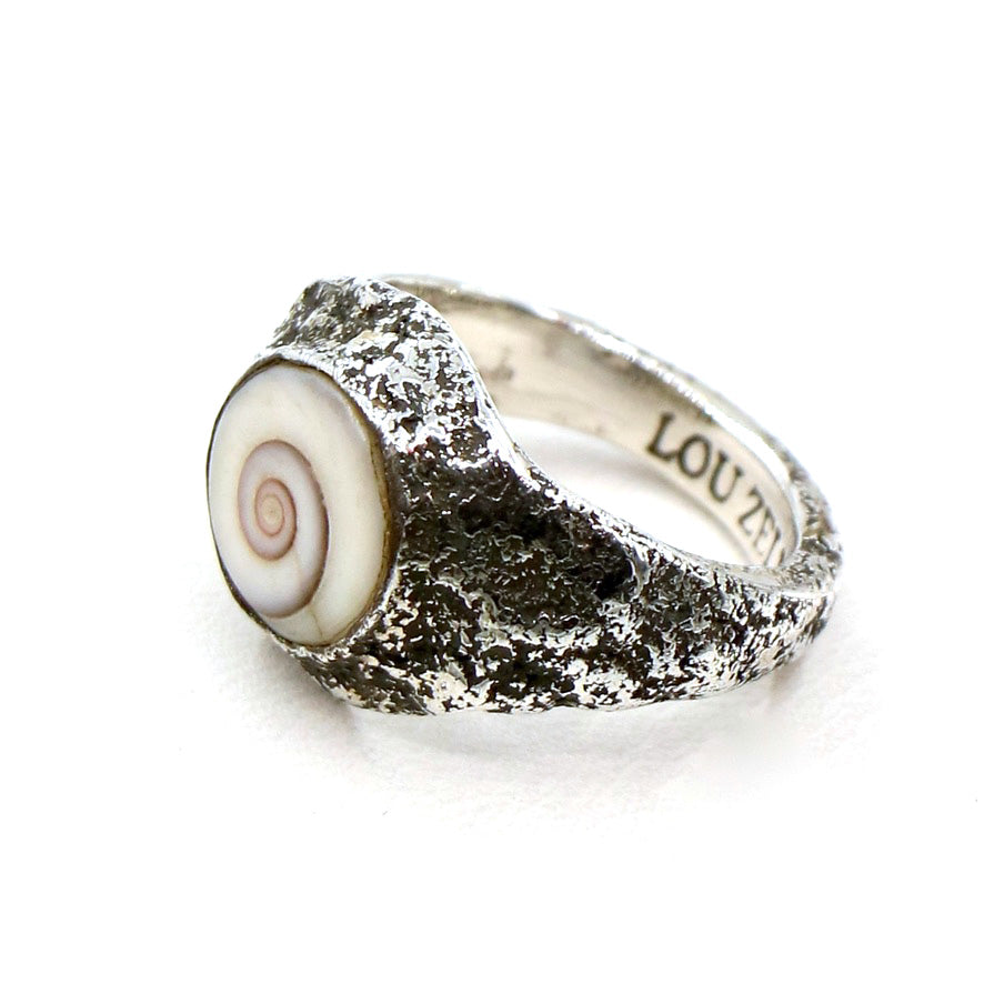 LoU was a great collector of shells along the shorelines throughout his travels and this one is no acceptation. It is a 'shiva eye' shell found on the eastern shores of Bali. Set in his textured band it makes a great pinky or any type of ring on any hand. It has his insignia stamped inside the band and is a wonderful classic LoU design.