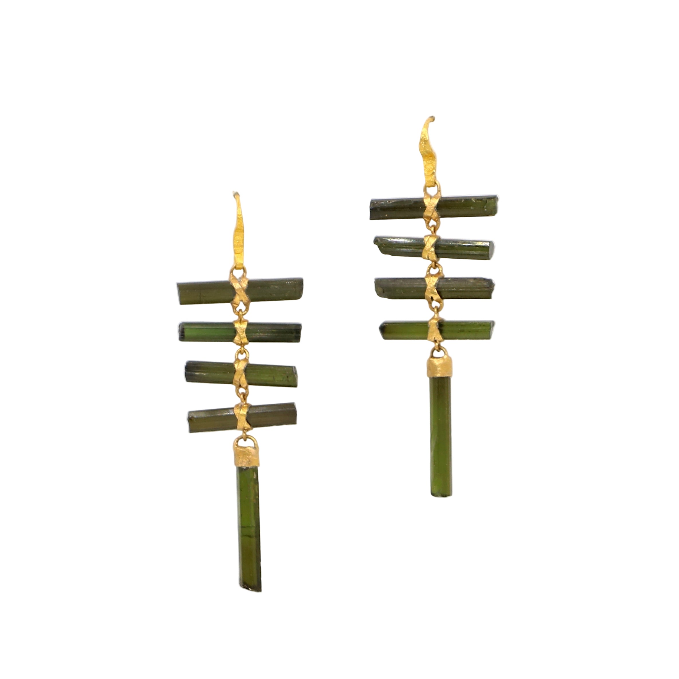 The absolute classic LoU Zeldis earring. He created these fabulous tourmaline wand earrings and they were sought after far and wide. This is the final pair that remain in the collection and they are exquisite ones... dark green / black tourmaline and solid 22 k gold wands. They are on the original wires. A treasure indeed!!