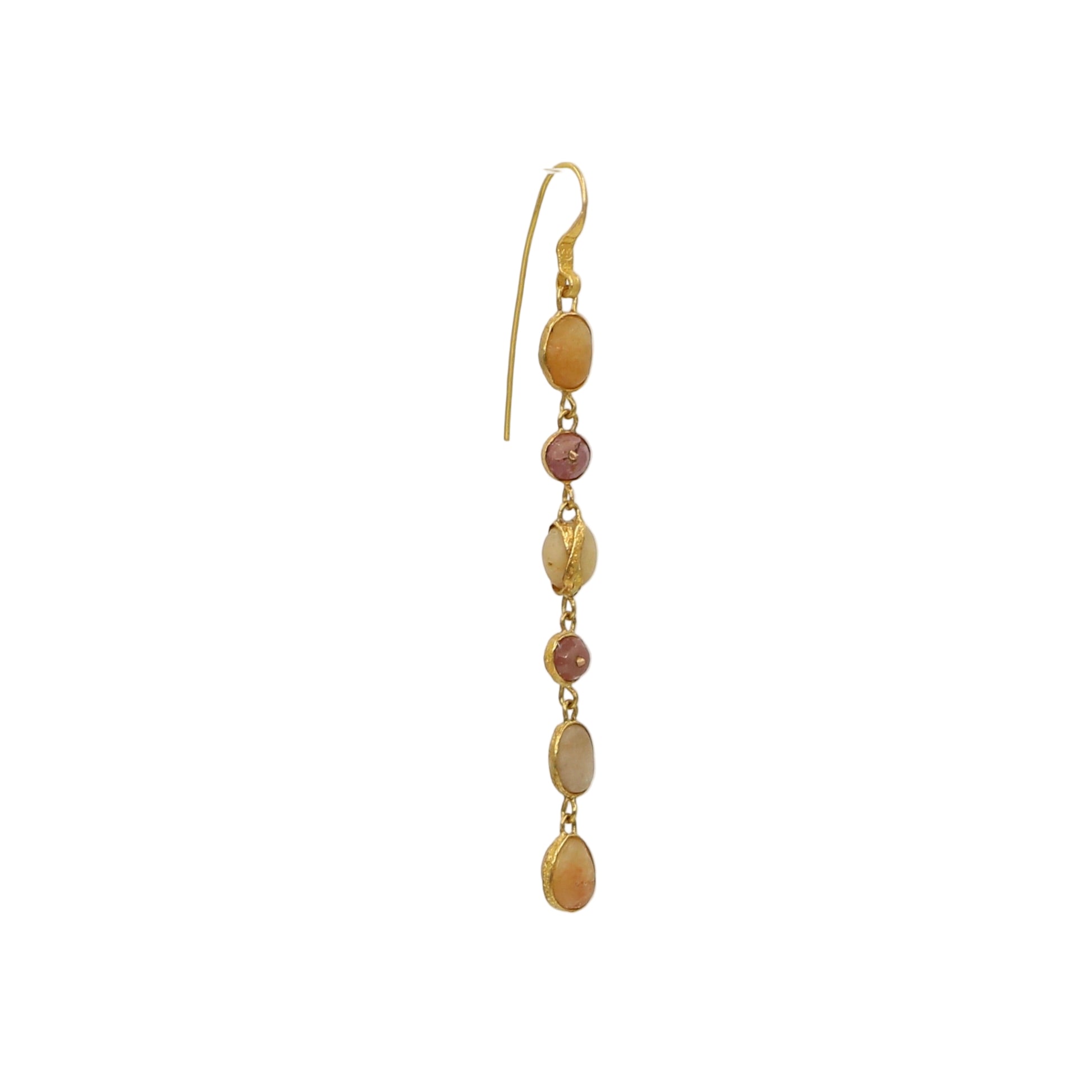 An incredibly rare pair of six drop stone, agate and ruby earrings. These are LoU design classics. The gold is 22k solid and they are on original LoU wires. This may in fact be the only remaining six drop earrings in the collection. They shimmer and dangle with an amazing elegance as only long multi drops can do.They are absolute beauties.
