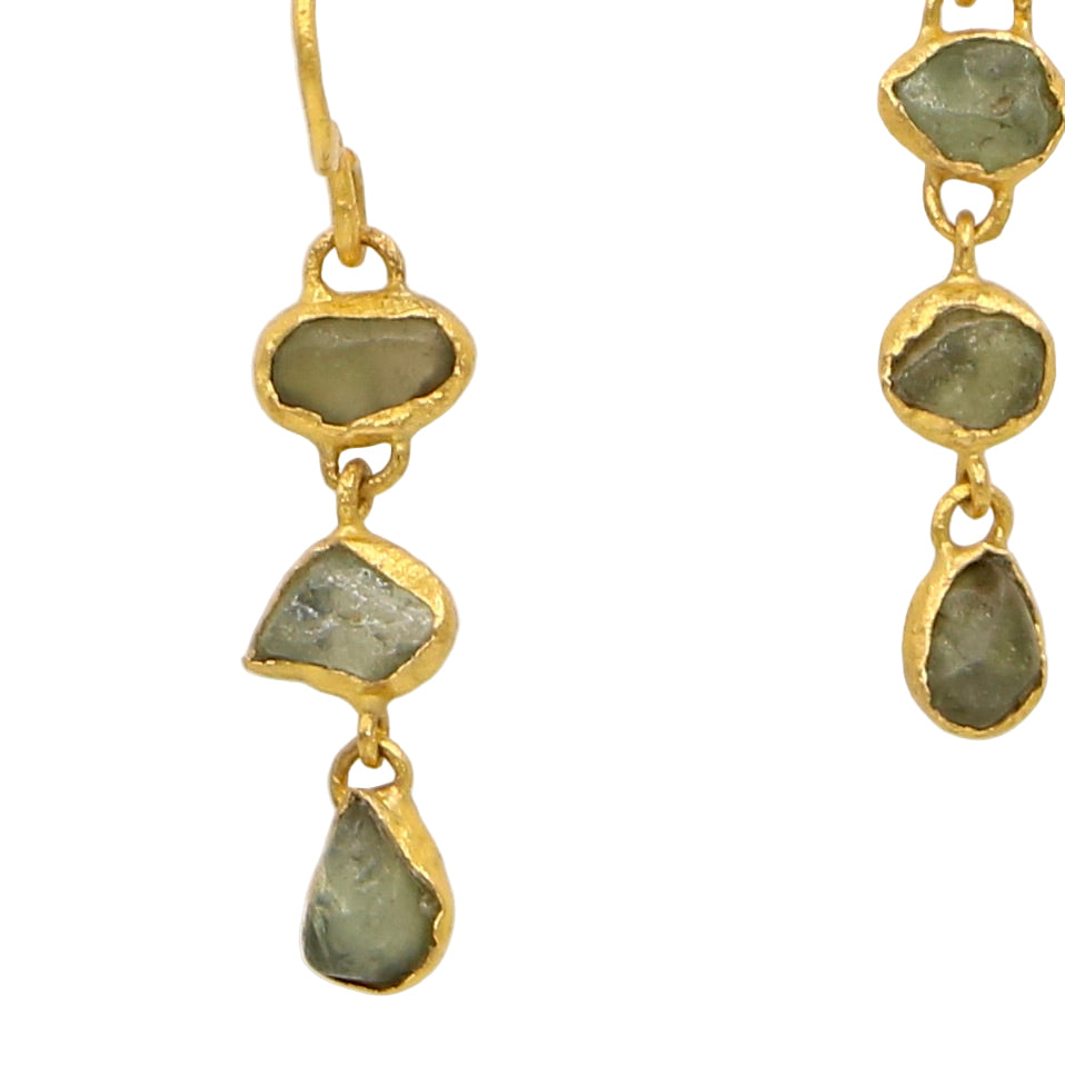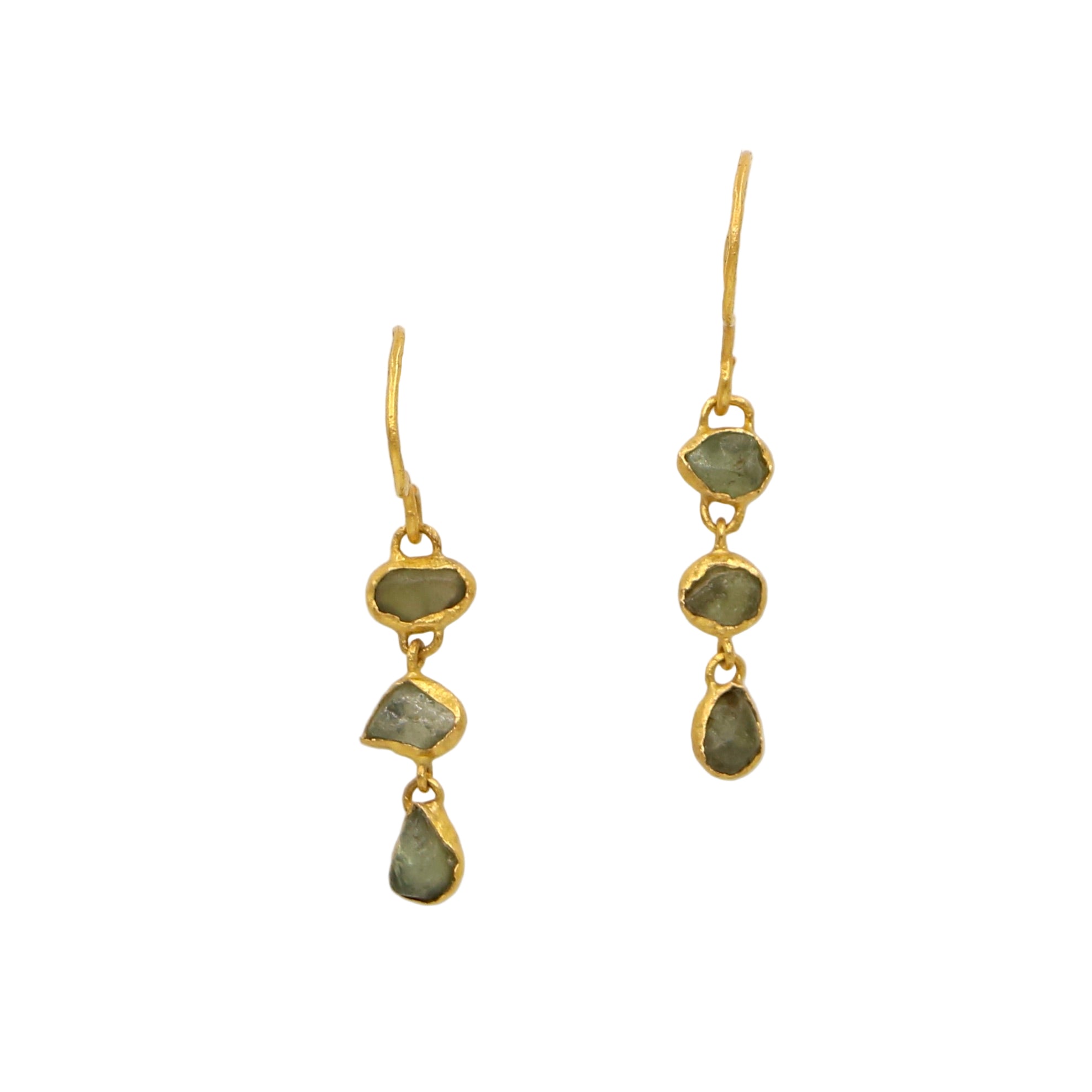 A wonderful triple drop pair of solid 22k gold and raw uncut sapphire earrings. They are a beautiful design and a classic LoU earring. They can be an informal daily wear or a dressier pair which is the beauty of LoU's creations.