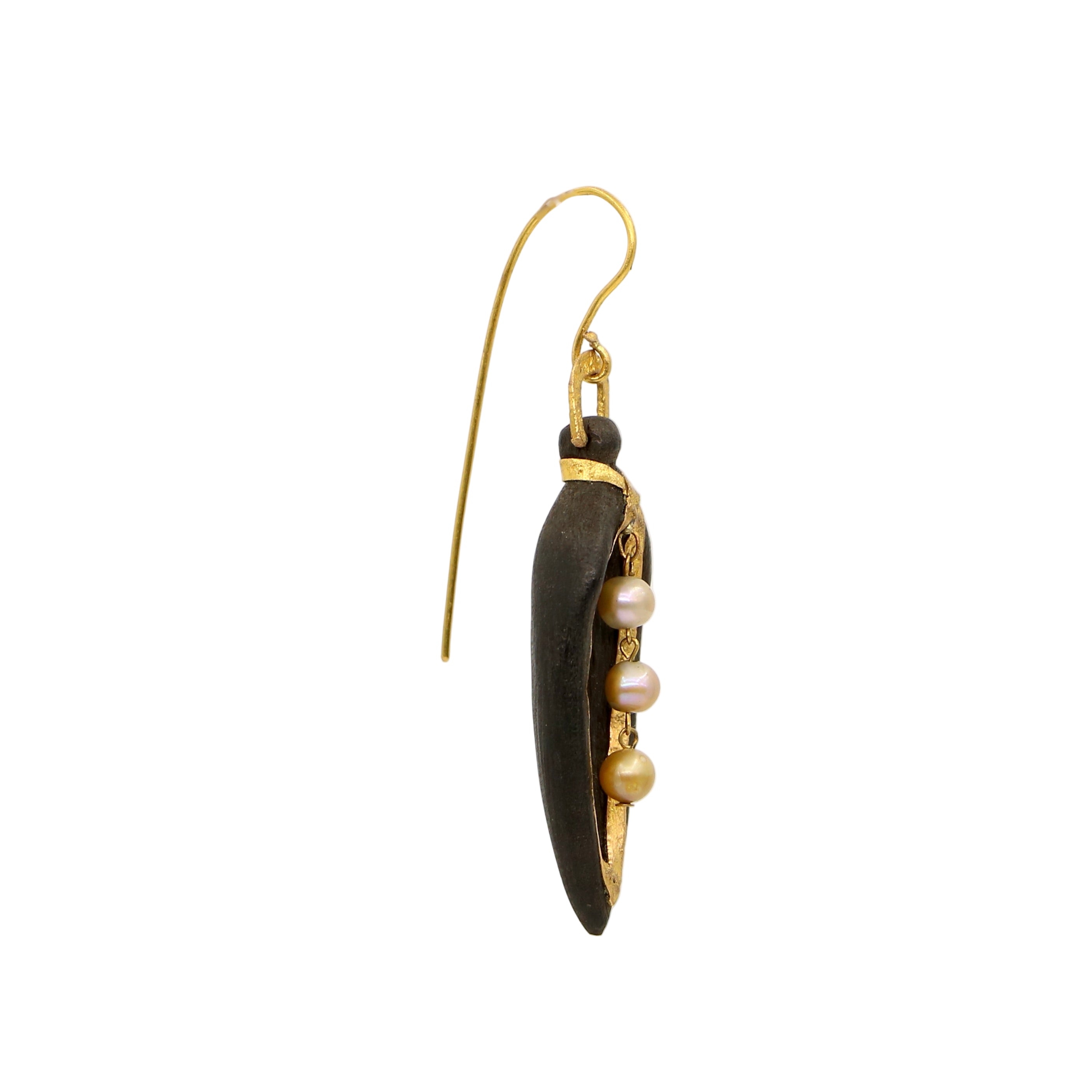 A gorgeous pair of carved black wood, 22k solid gold and fresh water pearl earrings. These pod forms are a very classic LoU design that he worked with and these in particular are exquisite.