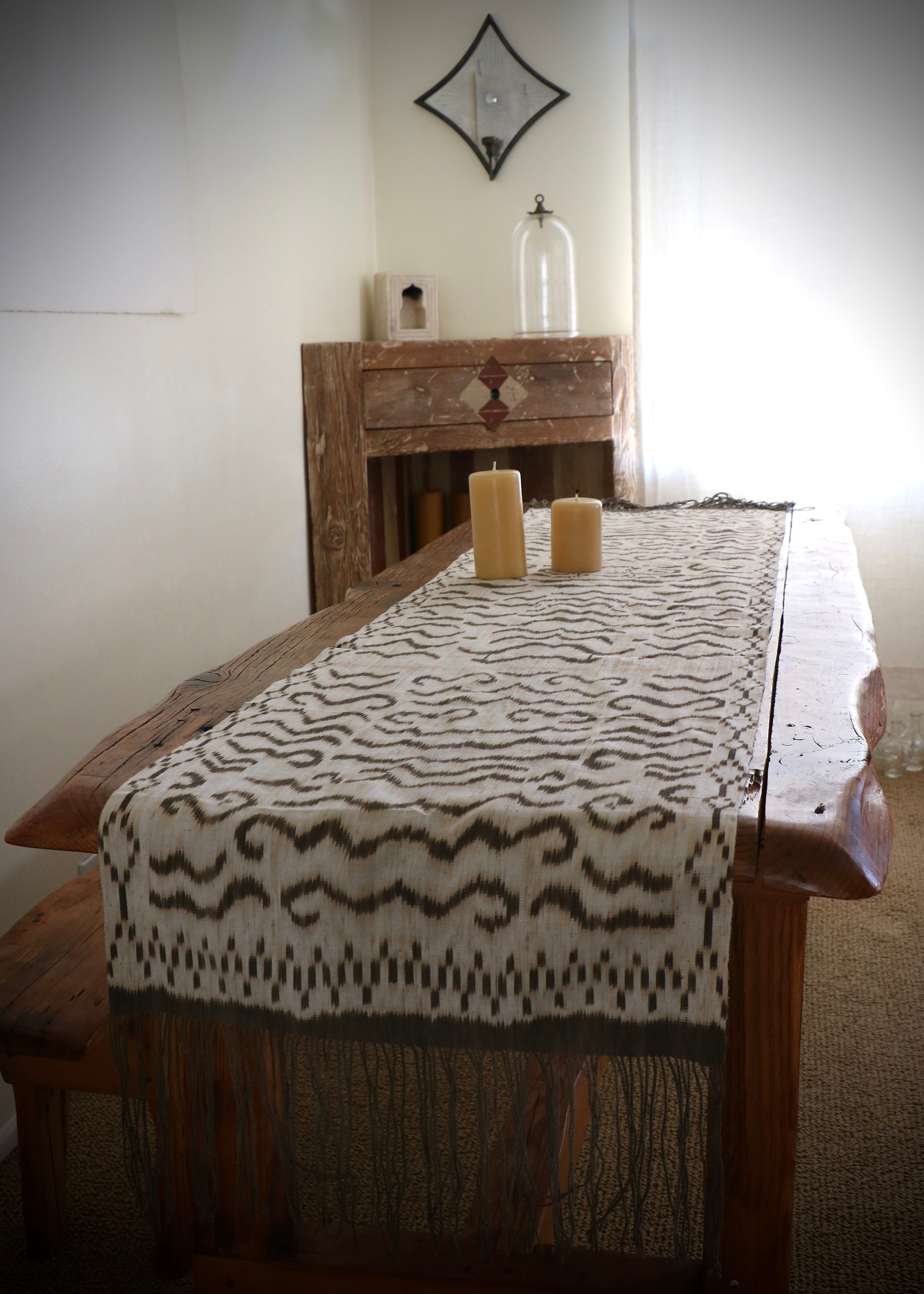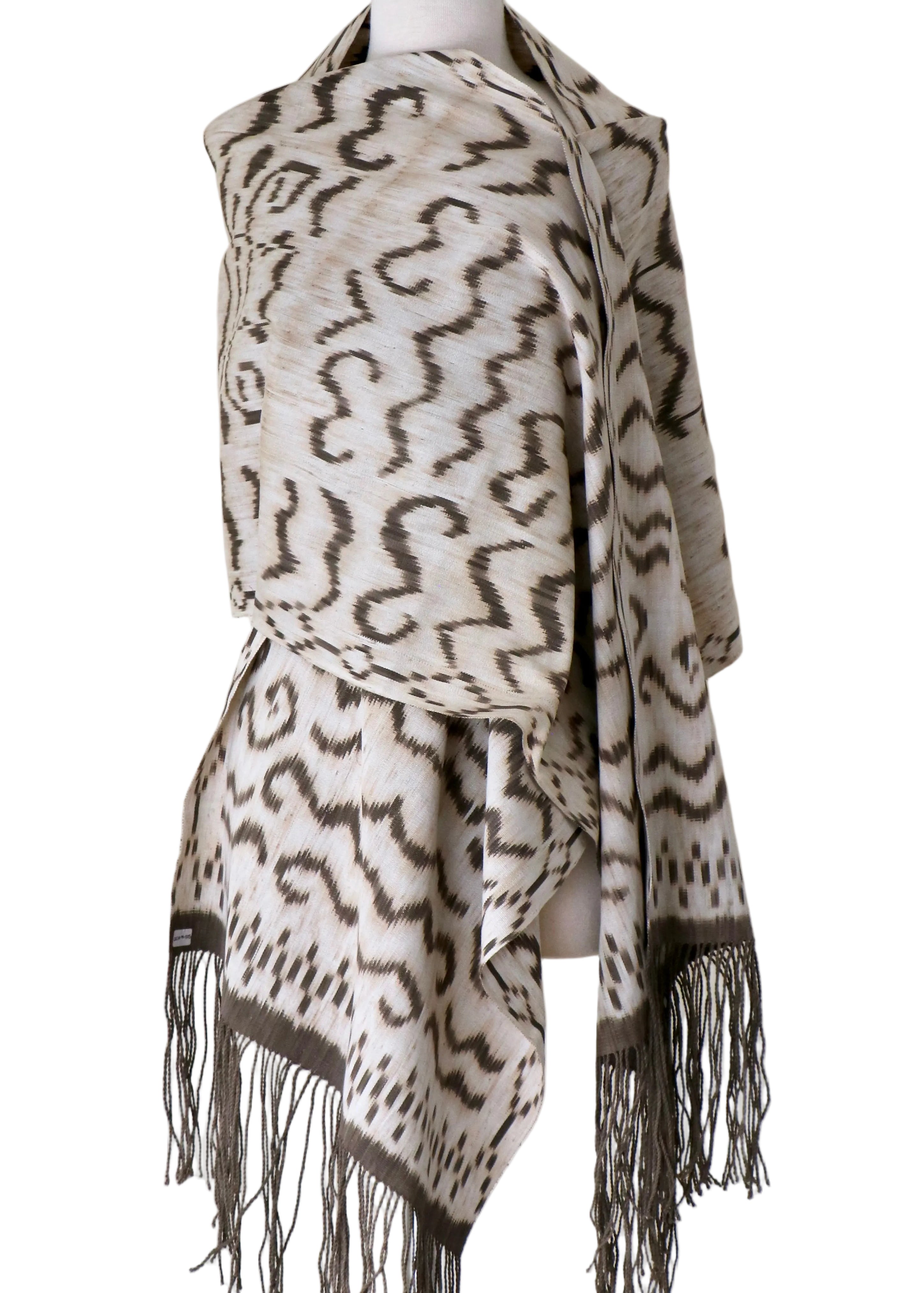 A fabulous 'tiger ikat' created on the island of Sumba in Indonesia. These textiles LoU created are heavily sought after. All natural dyes, hand woven natural fibers with a lusciously soft feel. Perfect as a wrap, a scarf or a dramatic wall hanging.