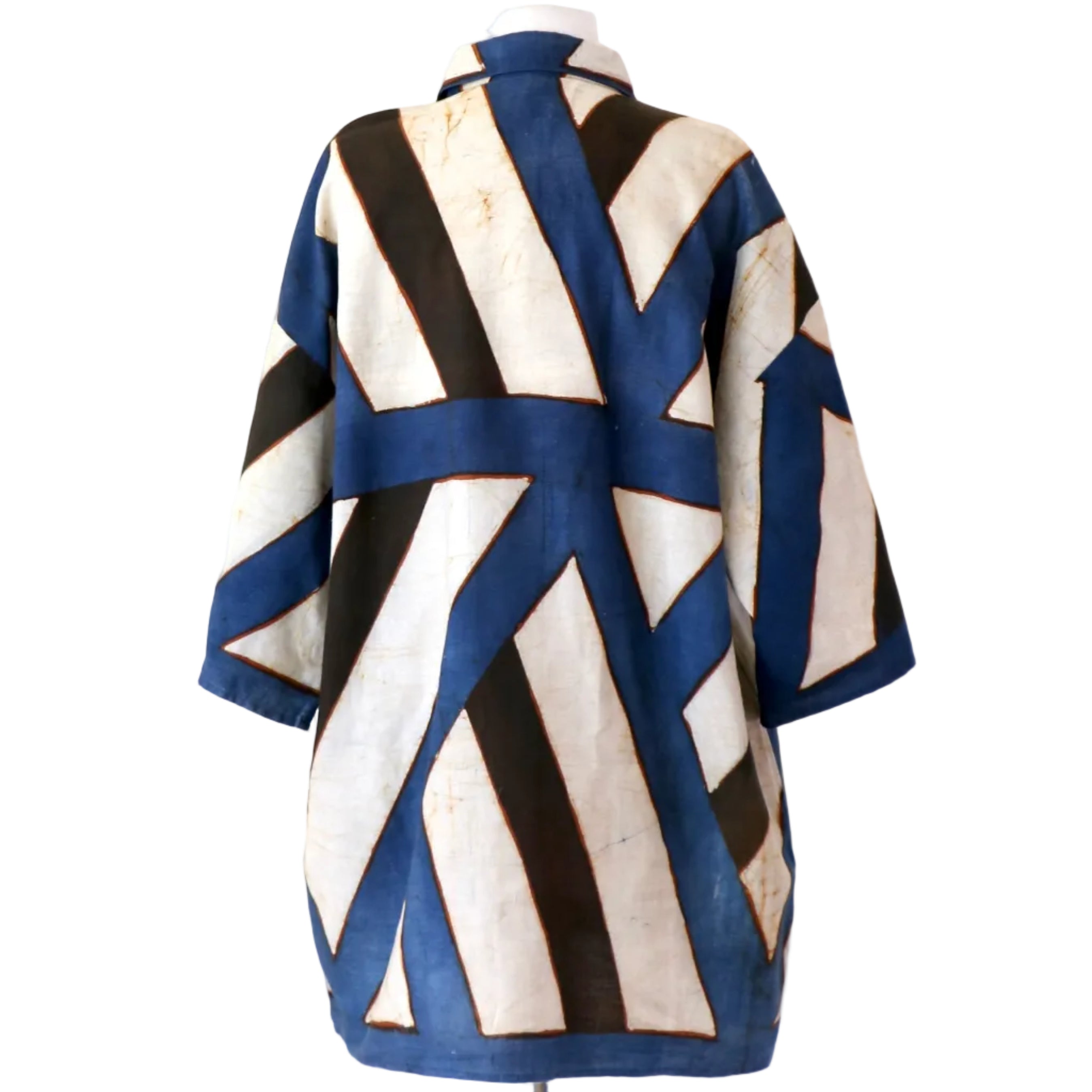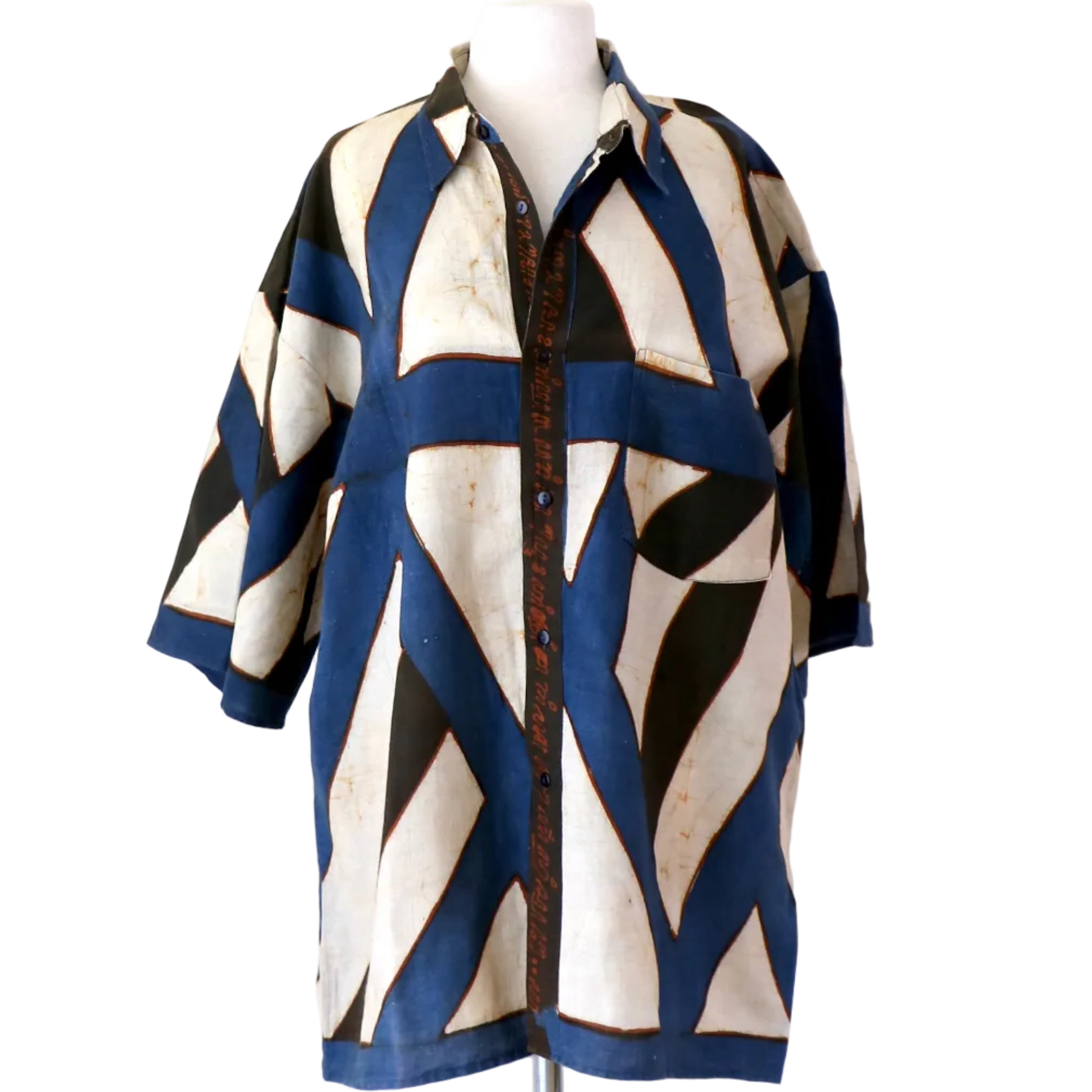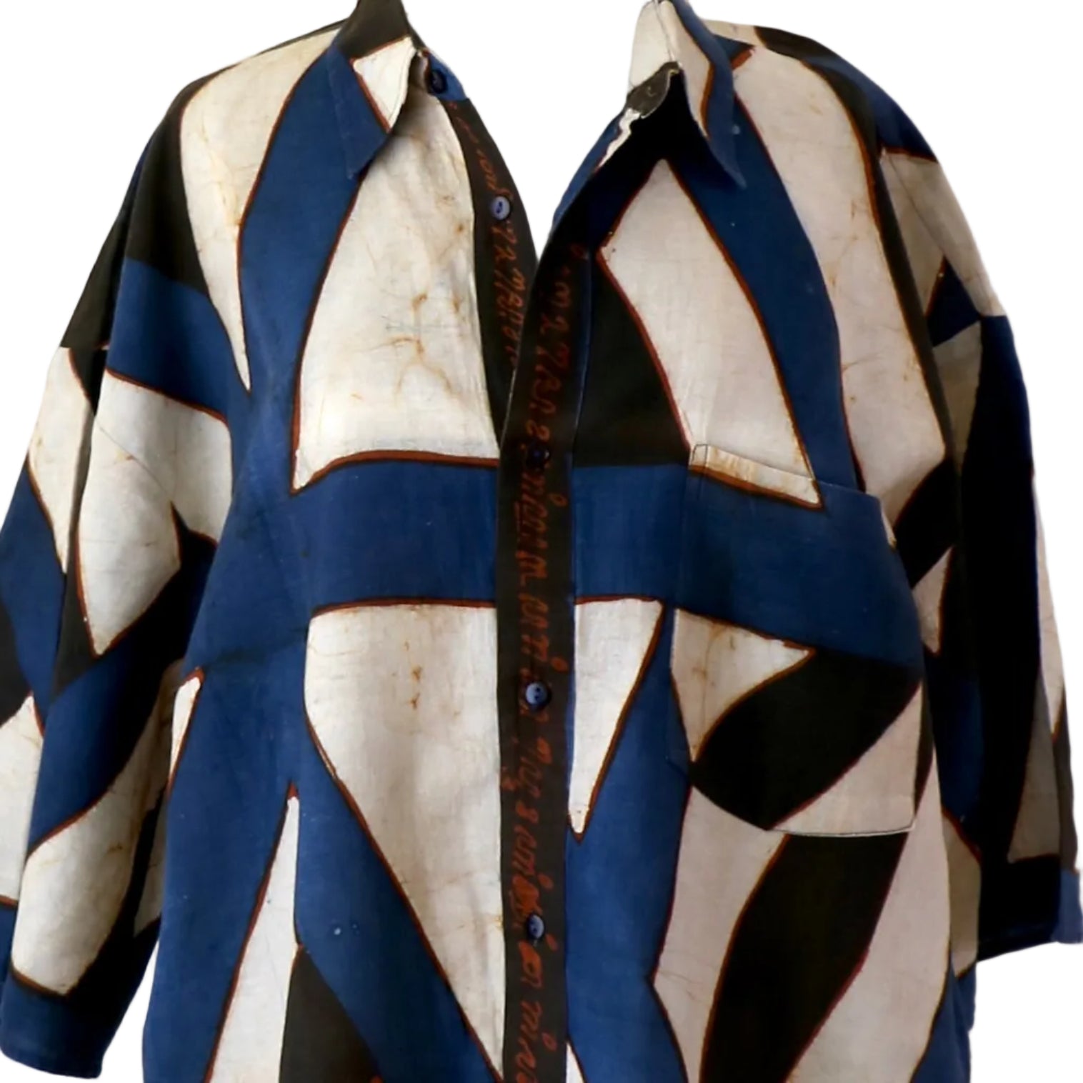 LoU created these original shirts during the time he was residing in Indonesia. The batik work was created on the island of Java with master batik and dye craftspeople. LoU then took these fabulous batiks and constructed the shirt shown here. His original tag and insignia is on the shirt. No two batiks and therefore shirts are alike. The all natural textiles and dyes become softer over time, while we recommend hand washing these pieces, machine washing is fine as well.