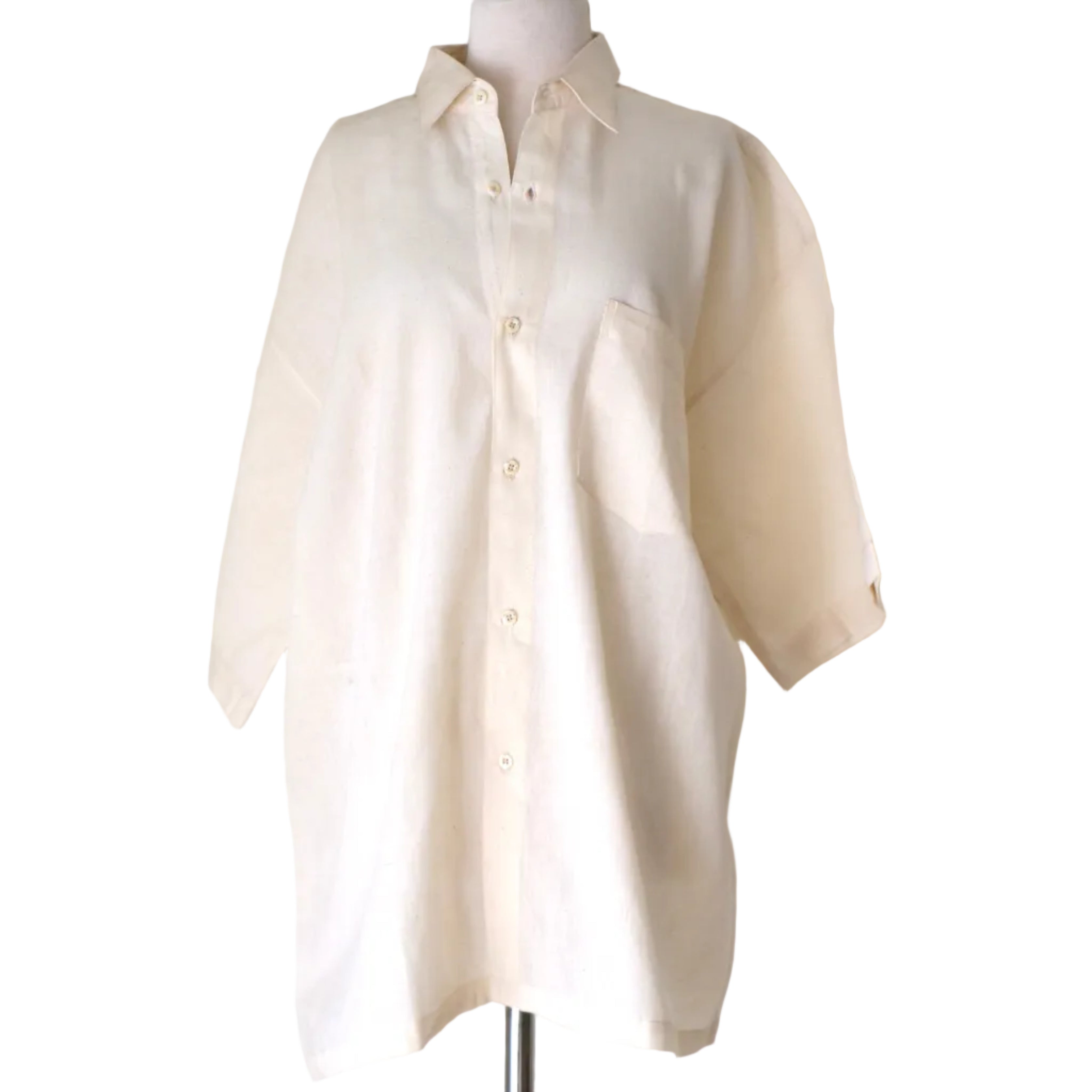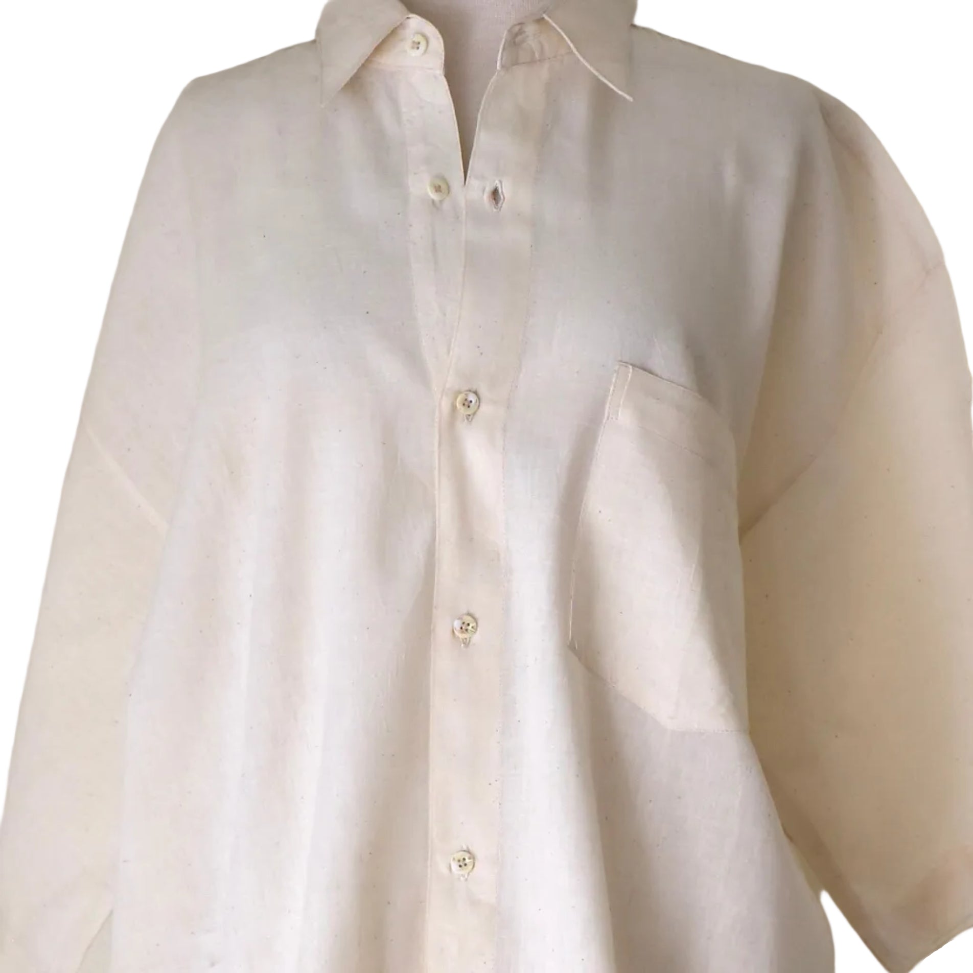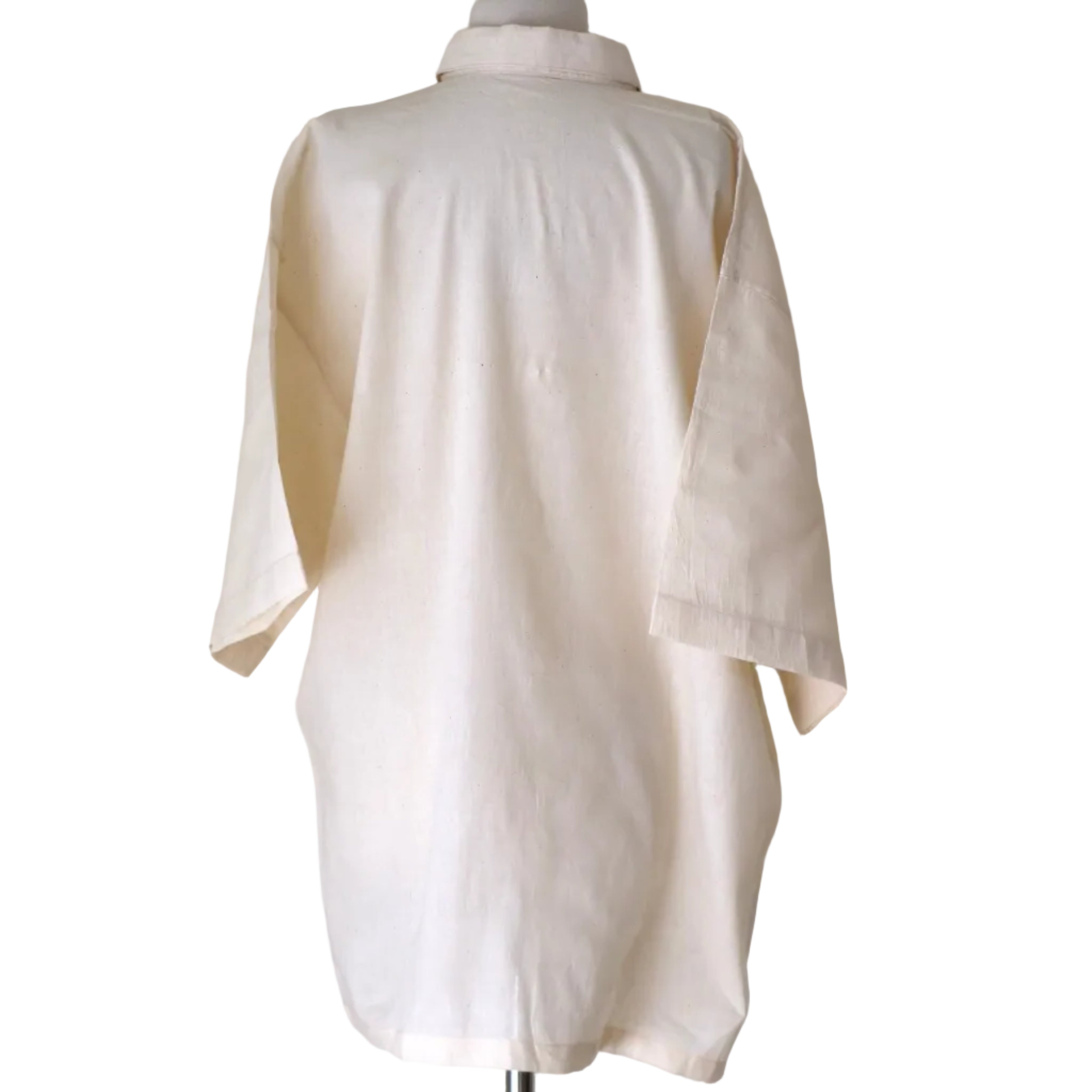 LoU created these original shirts during the time he was residing in Indonesia. LoU constructed the shirt shown here. His original tag and insignia is on the shirt. The all natural textiles and dyes become softer over time, while we recommend hand washing these pieces, machine washing is fine as well. The dimensions below are the circumference around the chest just above the pocket and from the top of the collar to the base of the shirt. Additionally we have added a third measurement in parenthesis that is the circumference from the base of the armpits around the shirt. These shirts are styled after classic Hawaiian shirts and while at times there may be a size tag sewn in, it is often a bit different than what is sewn in as the tag size. We highly recommend taking measurements on your own body to determine if the shirt will be a good fit. The shirts are intended to be boxy in nature.