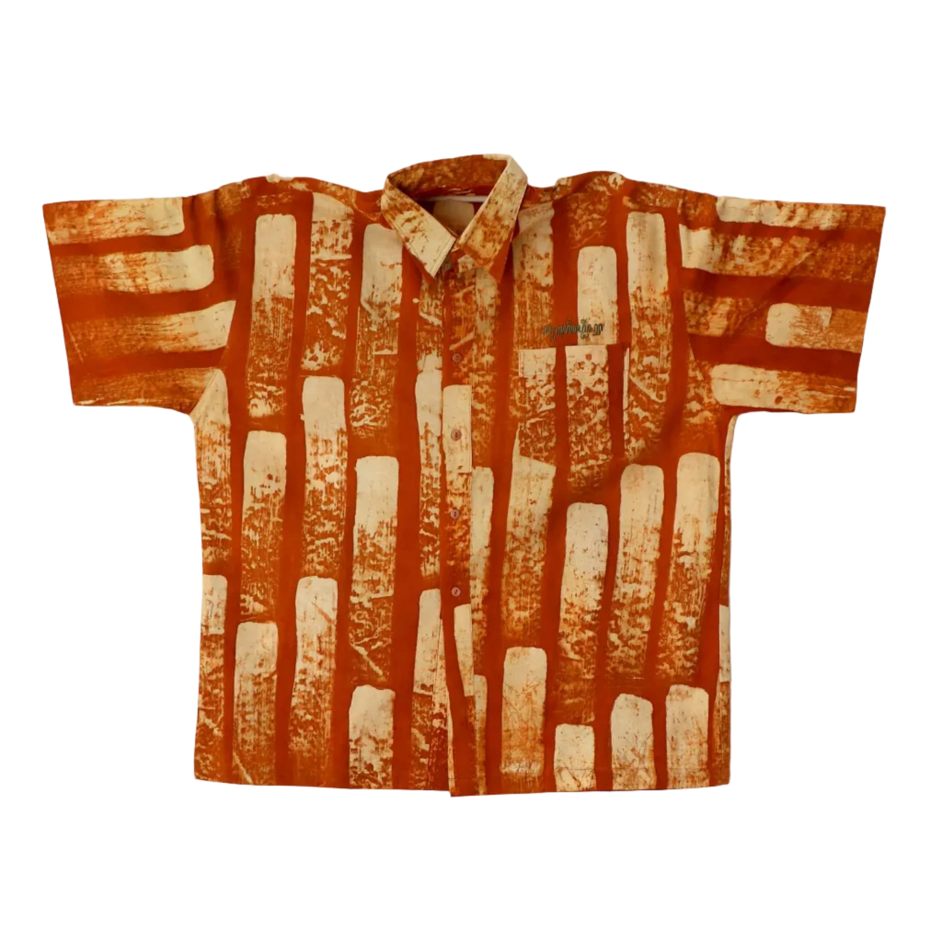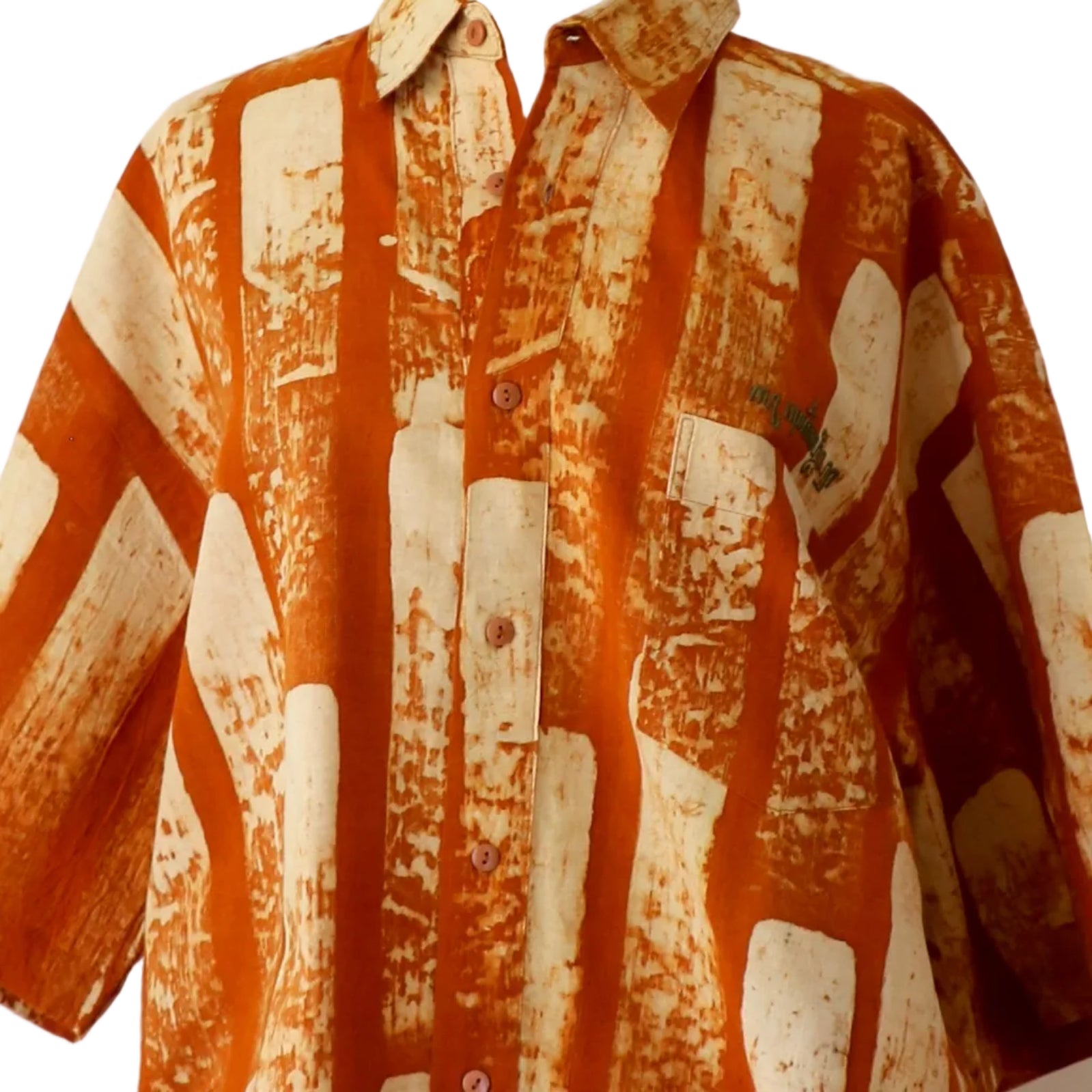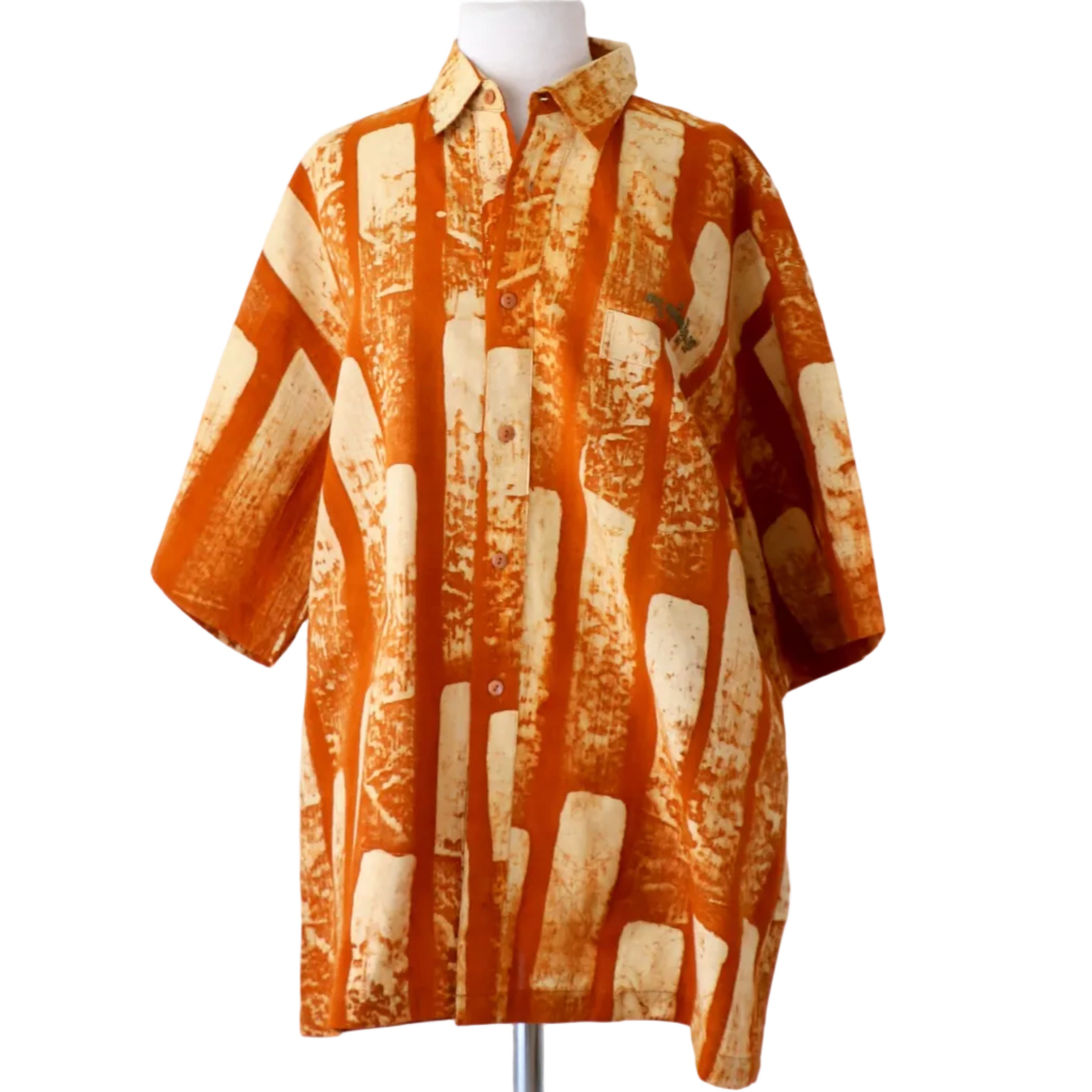 LoU created these original shirts during the time he was residing in Indonesia. The batik work was created on the island of Java with master batik and dye craftspeople. LoU then took these fabulous batiks and constructed the shirt shown here. His original tag and insignia is on the shirt. No two batiks and therefore shirts are alike. The all natural textiles and dyes become softer over time, while we recommend hand washing these pieces, machine washing is fine as well. The dimensions below are the circumference around the chest just above the pocket and from the top of the collar to the base of the shirt. Additionally we have added a third measurement in parenthesis that is the circumference from the base of the armpits around the shirt. These shirts are styled after classic Hawaiian shirts and while at times there may be a size tag sewn in, it is often a bit different than what is sewn in as the tag size. We highly recommend taking measurements on your own body to determine if the shirt will be a good fit. The shirts are intended to be boxy in nature.
